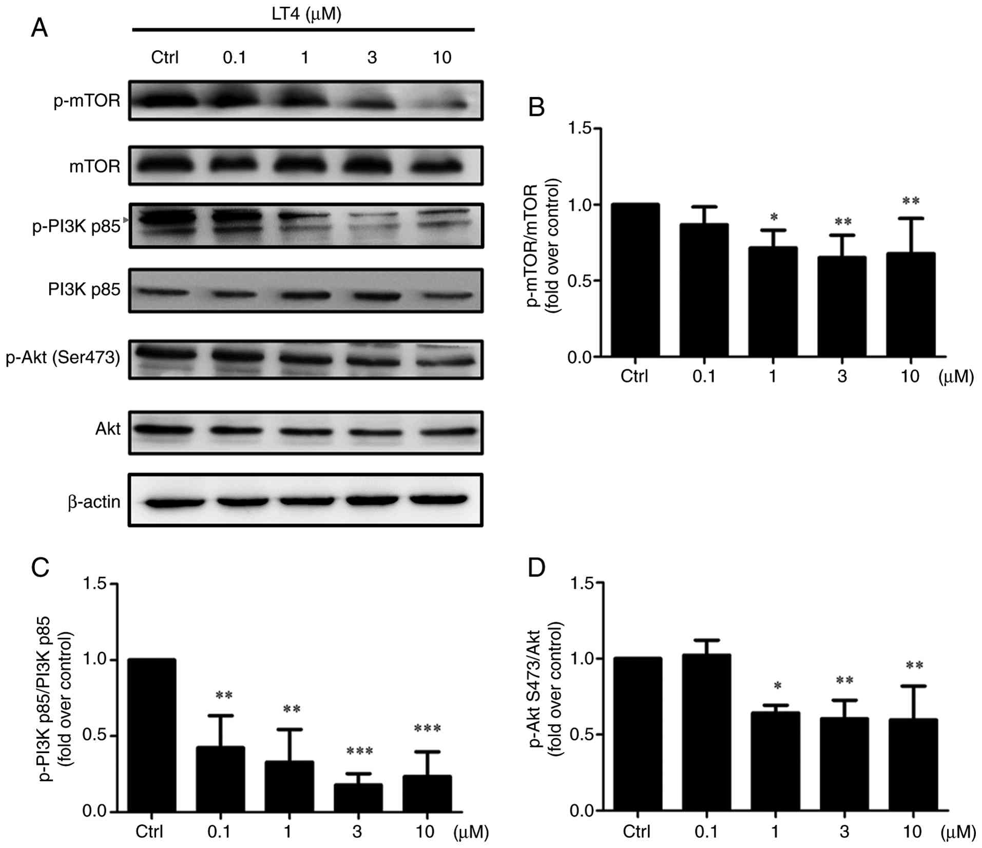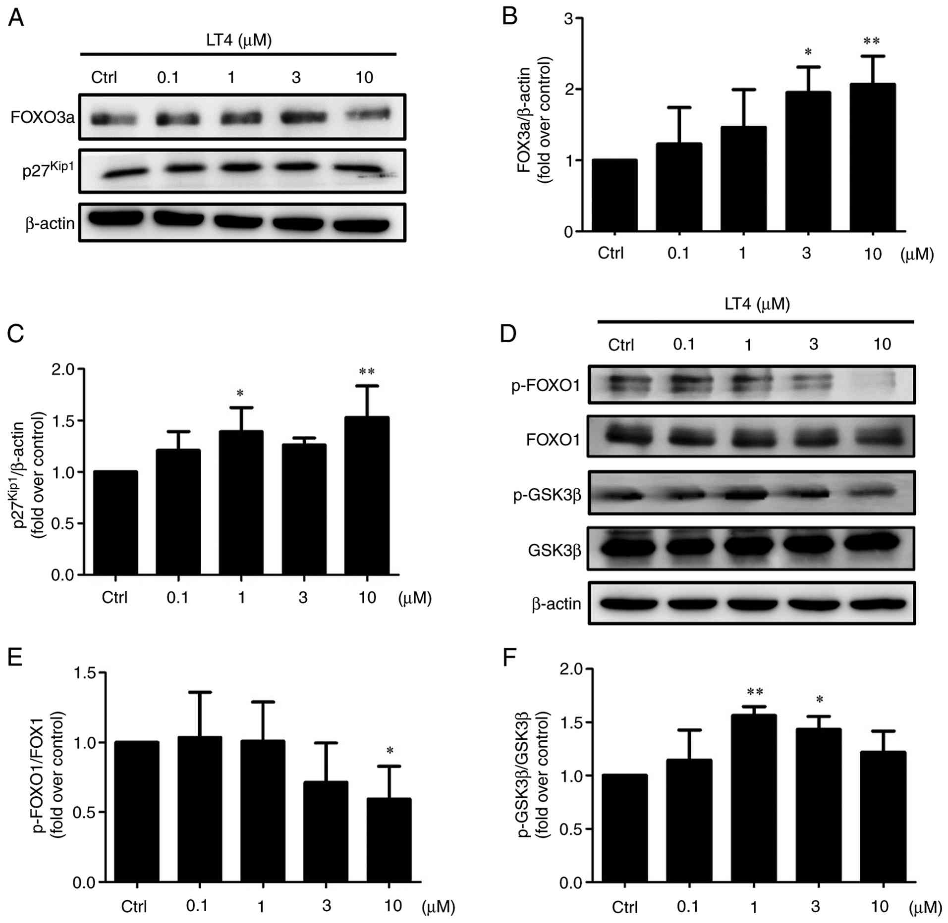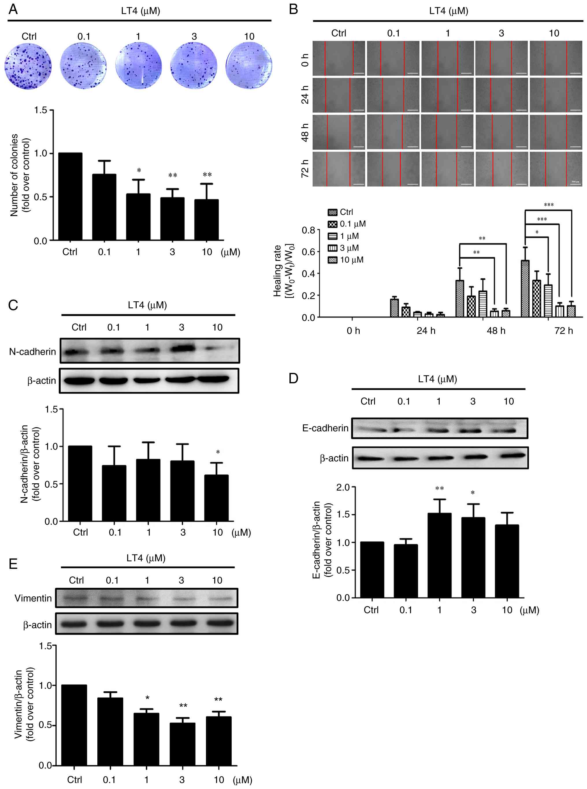 To investigate the effect of LT4 on cell migration, a wound healing assay was next conducted. Compared with the control group, LT4 treatment markedly inhibited cell migration in a time- and dose-dependent manner (Fig. 2B). Quantification of the healing rates revealed that 3 and 10 μM LT4 significantly delayed wound closure at both 48 and 72 h.