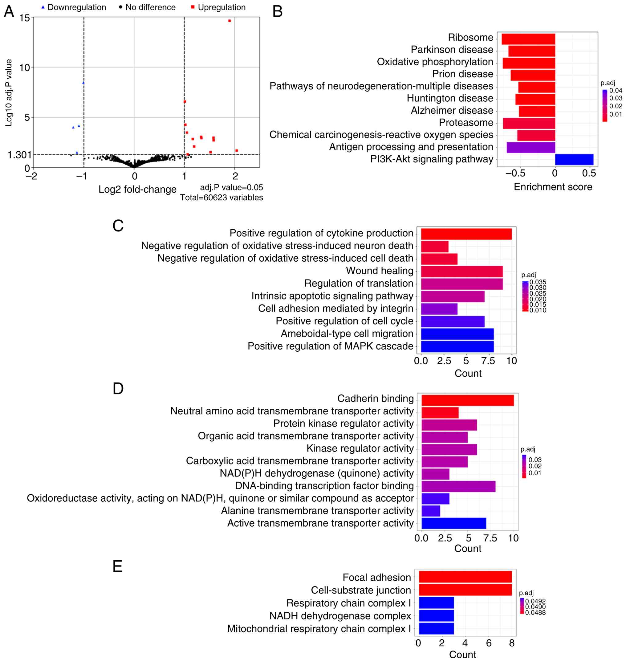 To elucidate the functional relevance of these DEGs, KEGG and GO enrichment analyses were performed. KEGG pathway analysis revealed significant enrichment in 'PI3K-Akt signaling pathway', 'Antigen processing and presentation' and 'Chemical carcinogenesis-reactive oxygen species' (Fig. 3B). GO enrichment in the Biological Process category highlighted terms such as 'Positive regulation of cytokine production', 'Wound healing', 'Ameboidal-type cell migration', 'Positive regulation of MAPK cascade' and 'Intrinsic apoptotic signaling pathway' (Fig. 3C). In the Molecular Function category, enriched annotations included 'Cadherin binding', 'DNA-binding transcription factor binding', 'Protein kinase regulator activity' and 'Active transmembrane transporter activity' (Fig. 3D). GO analysis of Cellular Components further revealed enrichment in 'Focal adhesion' and 'Cell-substrate junction', structures essential for cell adhesion and signaling (Fig. 3E). These results suggest that LT4 modulates key gene expression programs associated with tumor survival, migration, stress adaptation and oncogenic signaling in CRC cells.