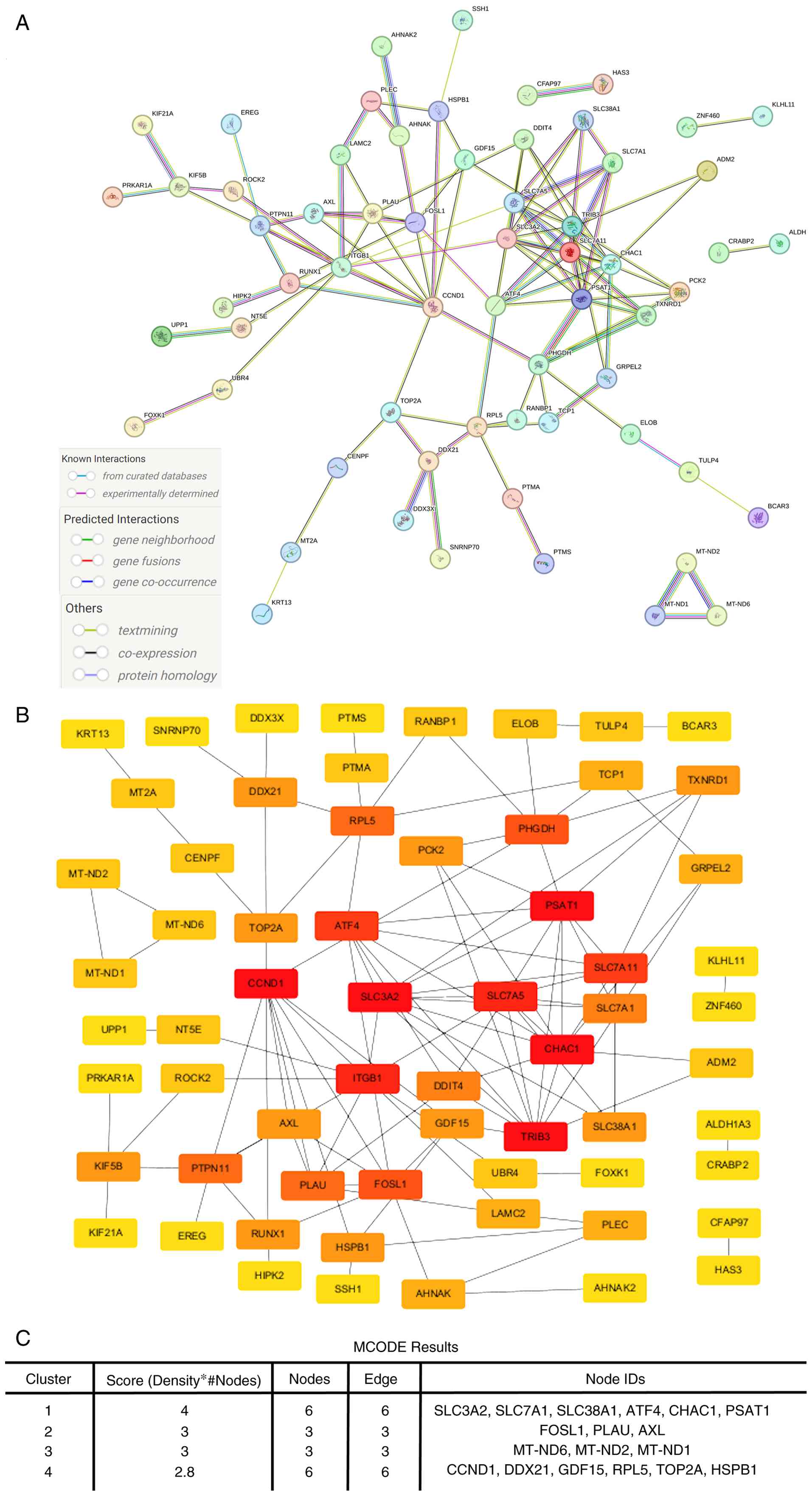 Further clustering analysis was performed using the MCODE plugin to identify densely connected modules within the PPI network. In total, 4 distinct clusters were identified and are summarized in Fig. 4C. Cluster 1 had the highest score (4.0), consisting of 6 tightly interconnected nodes: SLC3A2, SLC7A11, SLC38A1, ATF4, CHAC1 and PSAT1. These genes are associated with amino acid transport, oxidative stress response and cellular metabolism (29-33). Other clusters encompassed mitochondrial respiratory components and ribosome-related genes, indicating LT4-induced modulation of metabolic and proliferative signaling hubs. These clustering results closely aligned with the CytoHubba analysis, reinforcing the biological relevance of these modules.