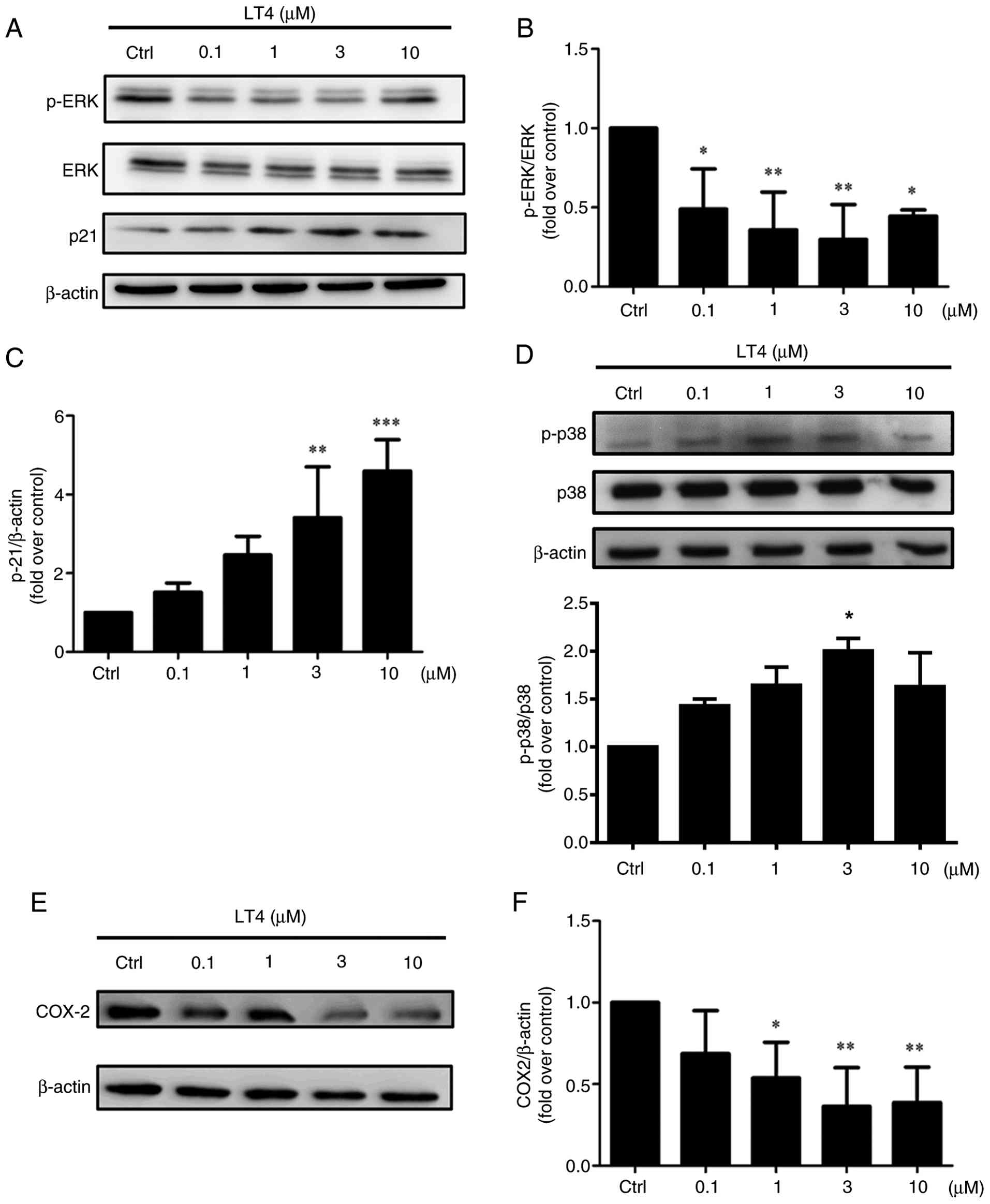 Together, these results support a model in which LT4 modulates multiple MAPK signaling branches to reduce proliferation (via ERK inhibition and COX-2 suppression) and induce cell cycle arrest (via p38-mediated p21 upregulation), complementing its effects on PI3K/AKT signaling.