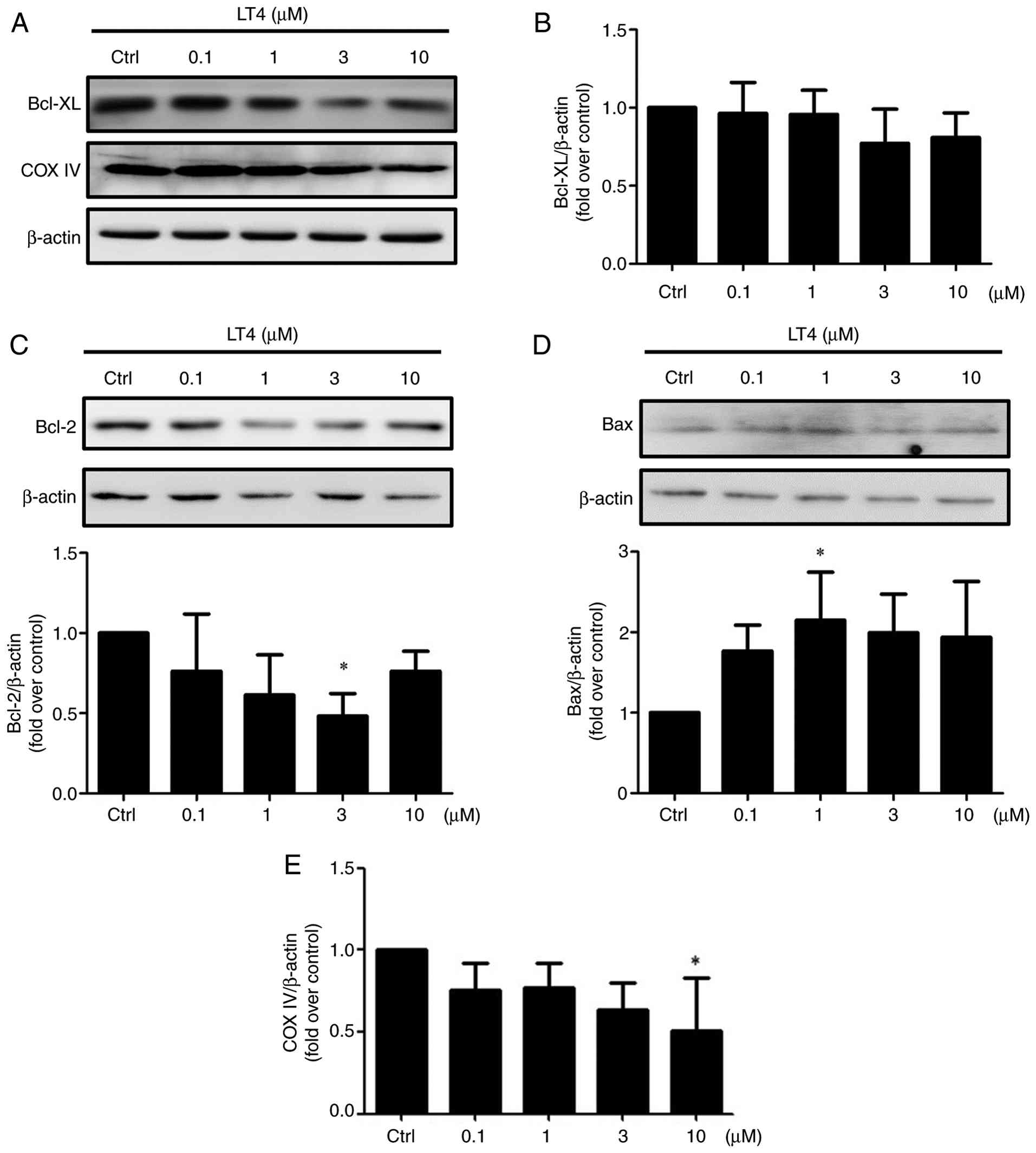 Since both p38 MAPK and the PI3K/AKT/GSK3β/FOXO axis are known to regulate apoptotic signaling (57-64), it was next investigated whether LT4 treatment modulated Bcl-2 family protein expression in HCT116 cells. As shown in Fig. 8A and B, Bcl-XL levels showed no significant changes across the tested concentrations. By contrast, Bcl-2 was significantly reduced at 3 μM LT4 (Fig. 8C). Conversely, the expression of the pro-apoptotic protein Bax was significantly increased at 1 μM (Fig. 8D), consistent with a shift toward a pro-apoptotic Bcl-2/Bax balance following LT4 exposure. To further investigate whether LT4 also affects mitochondrial-associated protein expression, the expression of COX IV, a mitochondrial inner membrane protein commonly used as a mitochondrial marker (65), was assessed. COX IV expression was slightly but significantly reduced at 10 μM (Fig. 8A and E), suggesting that high-dose LT4 may alter mitochondrial-associated protein levels. Together, these data indicate that LT4 shifts Bcl-2 family protein expression toward a pro-apoptotic profile and is accompanied by a reduction in the mitochondrial marker COX IV at higher concentrations, suggesting possible involvement of mitochondrial-associated apoptotic signaling.