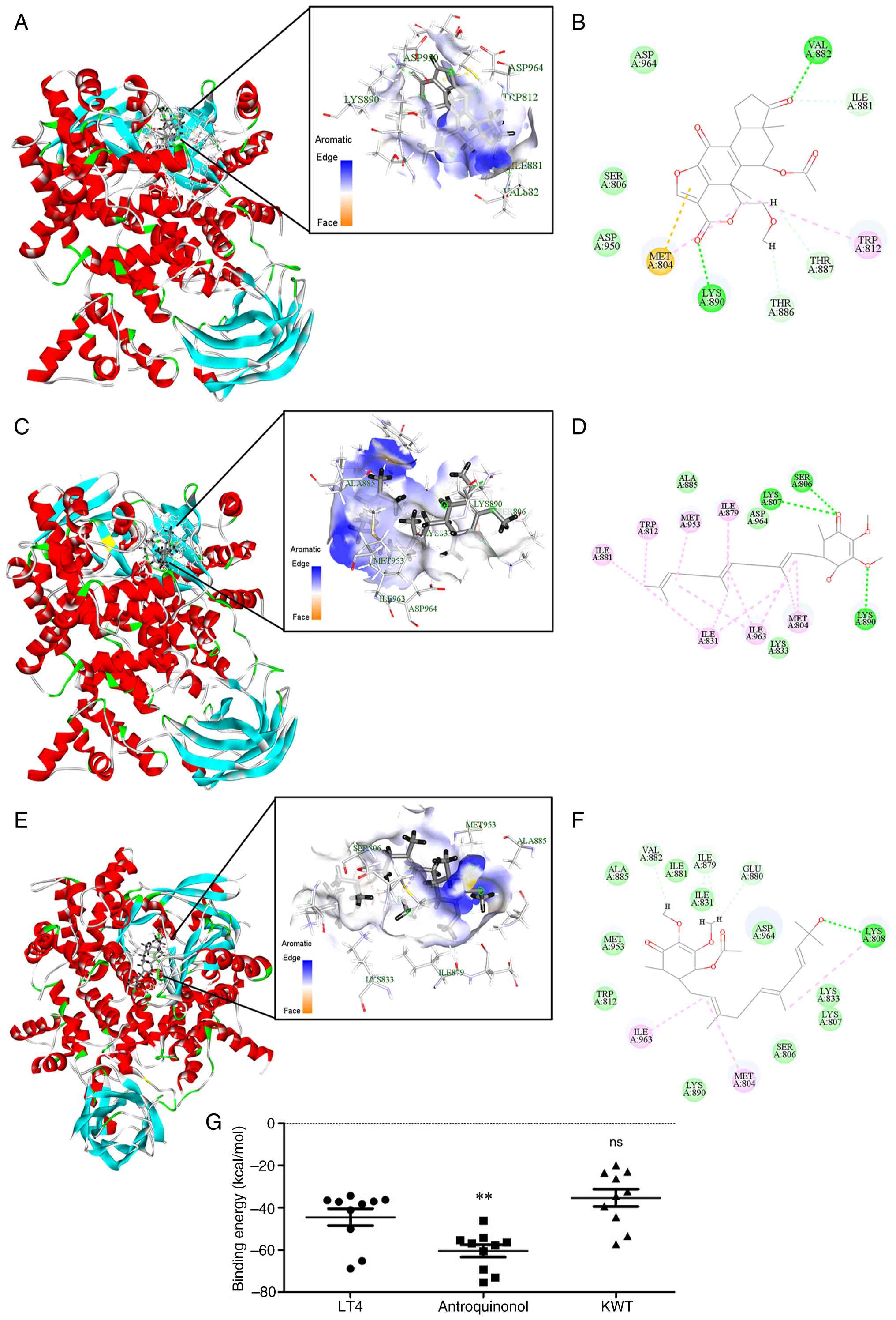 Binding energy calculations showed that antroquinonol had the strongest predicted binding energy (-60.49±2.90 kcal/mol), significantly lower than that of LT4 (-44.50±4.01 kcal/mol; P=0.0047), whereas LT4 and KWT (-35.37±4.13 kcal/mol) were not significantly different (Fig. 9G). While LT4 did not exhibit the most favorable predicted binding energy among the tested compounds, its consistent docking position and stable interaction profile within the PI3K active site support its potential to engage PI3K and contribute to downstream signaling inhibition, as observed in both transcriptomic and biochemical analyses.