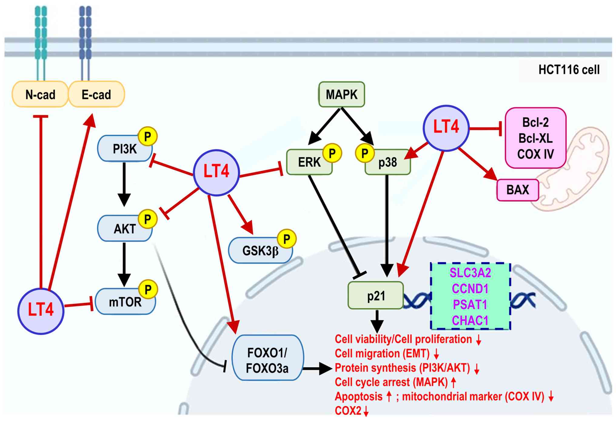 To further distill the mechanistic landscape of the effects of LT4, a summary schematic (Fig. 10) that integrates key signaling pathways and transcriptionally regulated nodes was constructed. This model highlights the ability of LT4 to interfere with PI3K/AKT/mTOR, GSK3β/FOXO, MAPK/p38 and apoptosis-related signaling cascades. The inclusion of PSAT1 and CHAC1 in this framework underscores their potential as novel downstream mediators of LT4's antitumor activity.