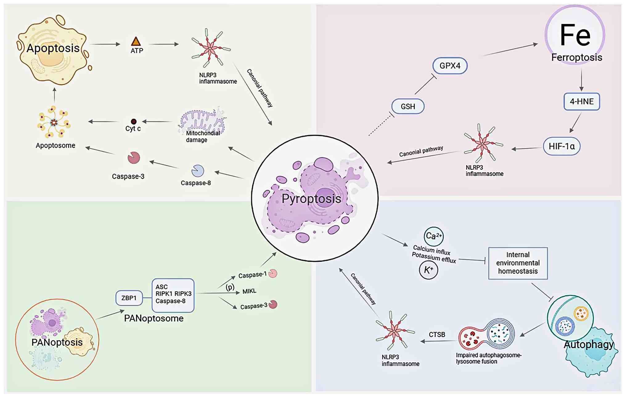 Recent evidence indicates that pyroptosis does not occur in isolation but rather engages in sophisticated crosstalk with other programmed cell death modalities, such as apoptosis and necroptosis. This complex regulatory network amplifies initial damage signals and dictates cellular fate, ultimately driving the progression of renal fibrosis (Fig. 4).