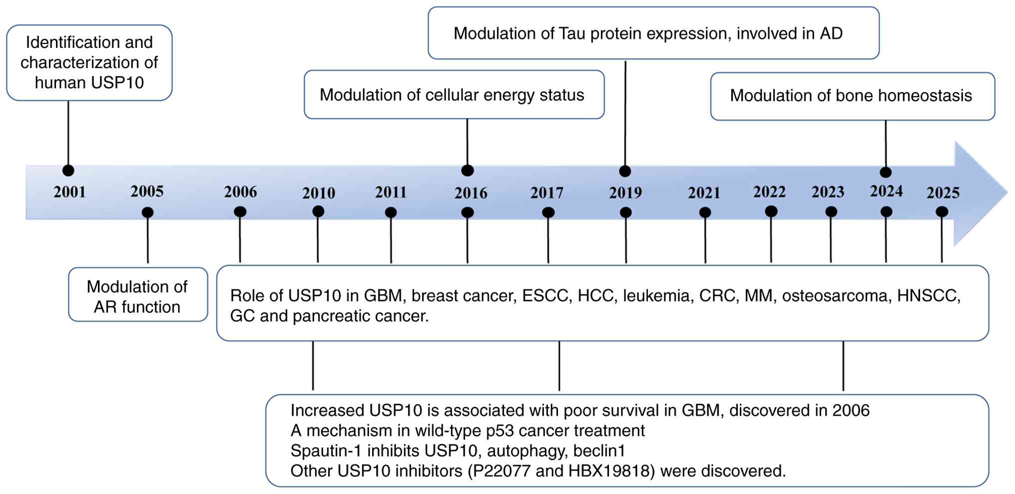 USP10, a deubiquitinase that interacts with Ras-GAP SH3-domain-binding proteins, was first described by Soncini et al (32) in 2001, and subsequent research has progressively revealed its diverse biological functions (Fig. 1). There have been reports that USP10 modulates p53 stability (33,34), autophagy (35,36), DNA damage response (DDR) (37-39) and cellular energy metabolism (40,41). While early studies primarily focused on its oncogenic roles in specific cancers, more recent findings highlight its broader biological functions, regulatory mechanisms and pathological relevance across multiple diseases. The present review offers a comprehensive overview of USP10 biology, with particular emphasis on its mechanistic links to human diseases and its potential as a therapeutic target, offering new perspectives for cancer and beyond.