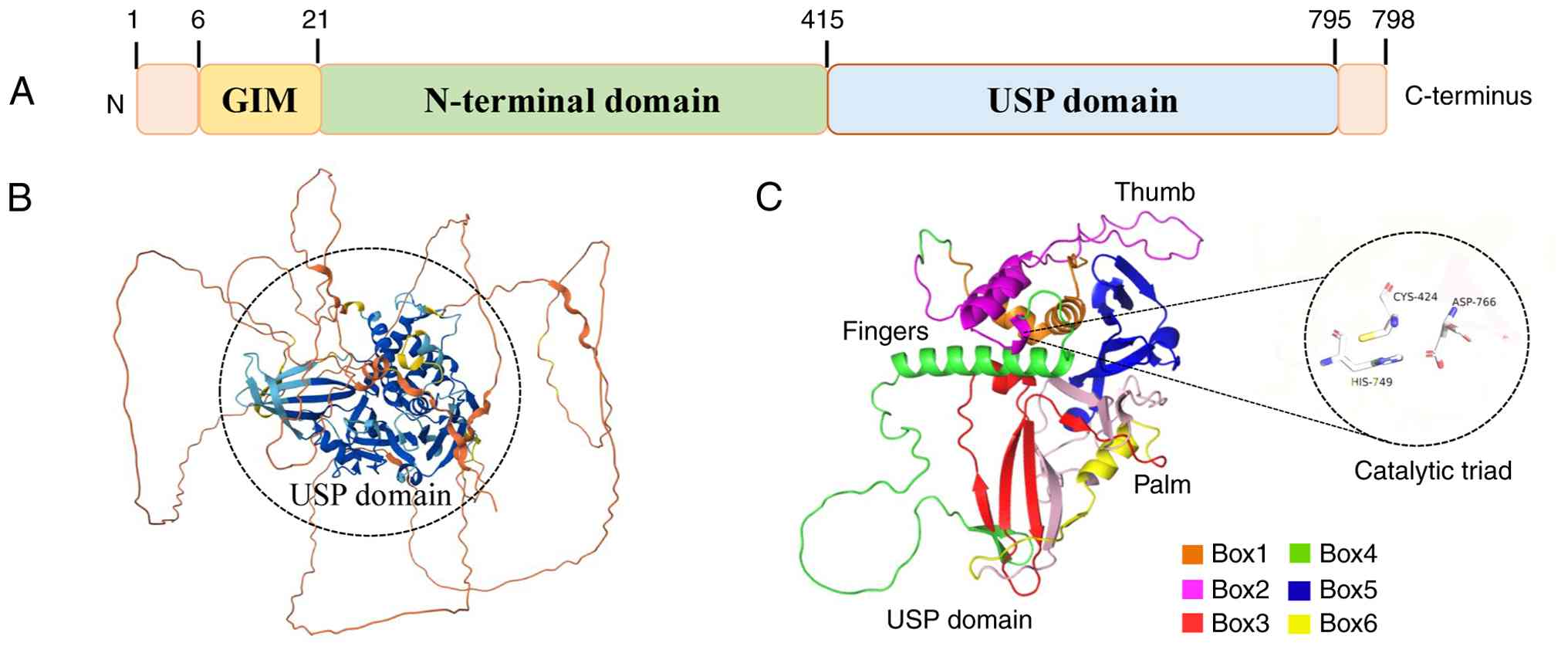USP10, also known as UBPO, is located on human chromosome 16q24.1 (42) and consists of 18 exons. The human USP10 protein is comprised of 798 amino acids (AAs), with a molecular weight of ~93 kDa (32). Its molecular structure (Fig. 2A) is composed of three domains: A RasGAP SH3 domain binding protein stress granule assembly factor 1 (G3BP1)-interacting motif, an N-terminal domain and a USP catalytic domain. The full-length model of USP10, predicted by AlphaFold (43,44), is shown in Fig. 2B. The USP domain can be divided into three subdomains: Finger, thumb and palm (45). The finger subdomain mediates engagement of the distal ubiquitin moiety within polyubiquitin chains, whereas the active site is formed at the thumb-palm interface and comprises a conserved catalytic triad of Cys, His and Asp/Asn residues (45). The catalytic core contains six conserved boxes found across nearly all USP family members (Fig. 2C). Boxes 1, 5 and 6 harbor the catalytic cysteine, histidine and aspartate/asparagine residues, respectively. Boxes 3 and 4 contain a Cys-X-X-Cys zinc-binding motif, which promotes proper USP core folding and facilitates interactions among motifs separated by hundreds of residues. The results of multiple sequence alignment show that the catalytic triad of USP10 may consist of Cys424, His749 and Asp766 (46).