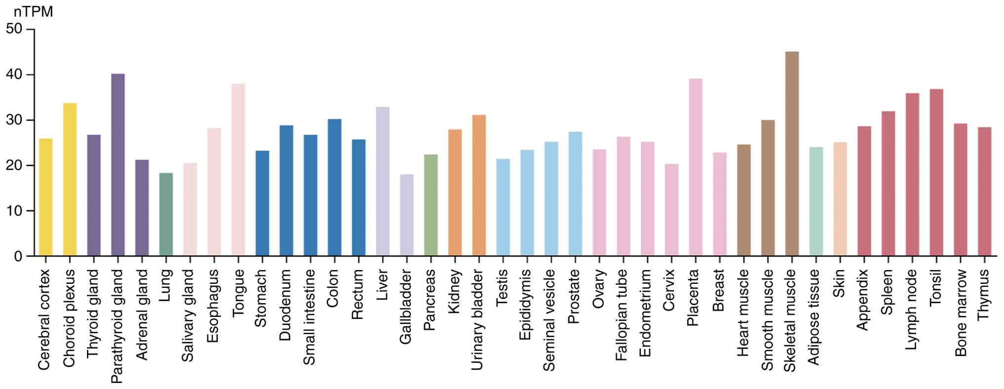 USP10 is evolutionarily conserved, sharing ~99% AA sequence homology with its mouse counterparts, and is broadly expressed in both the nucleus and cytoplasm of most cell types. Expression of USP10 has been detected in multiple human tissues, such as brain, kidney, adrenal gland, breast and stomach (47). The highest RNA expression of USP10 is observed in skeletal muscle (Fig. 3) according to the Human Protein Atlas (https://www.proteinatlas.org). Abnormal upregulation of USP10 has been reported in several cancer types, including osteosarcoma (36), breast cancer (48), pancreatic ductal adenocarcinoma (PDAC) (49), colorectal cancer (CRC) (50), prostate cancer (51), non-small cell lung cancer (NSCLC) (52), ovarian cancer (52), glioblastoma (GBM) (53), esophageal squamous cell carcinoma (ESCC) (54) and head and neck squamous cell carcinoma (55). Notably, USP10 expression is also found in lower eukaryotes such as yeast (56), where its homolog, UBP3, is essential for DNA repair (57).