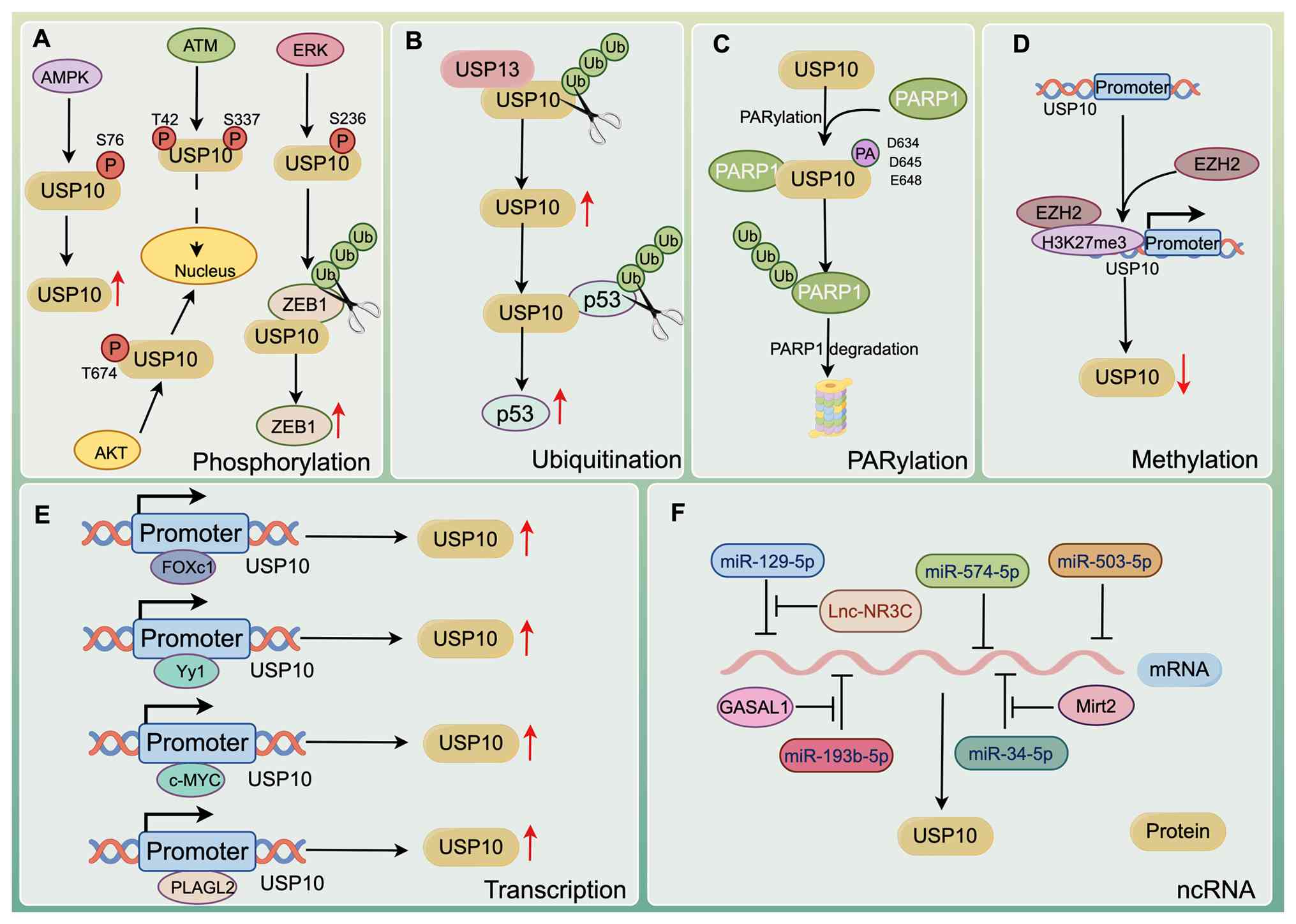 Such as most deubiquitinases, USP activity may be modulated through numerous mechanisms at both transcriptional and post-translational levels. Similarly, USP10 expression is tightly controlled by phosphorylation, histone methylation, ubiquitination, PARylation and transcriptional regulation (Fig. 4). Elucidating these regulatory mechanisms may provide critical insights for the development of novel therapeutic strategies targeting USP10.
