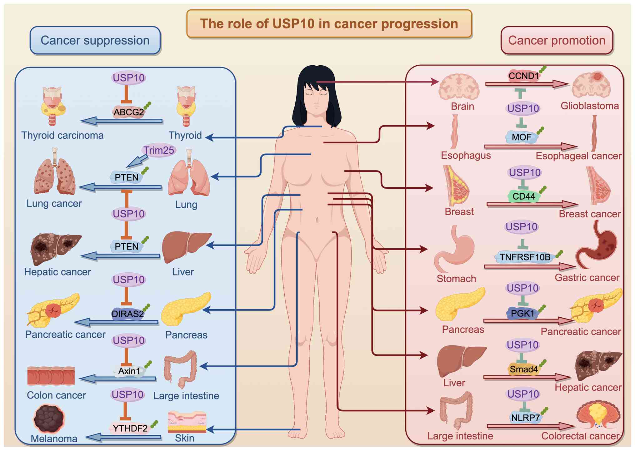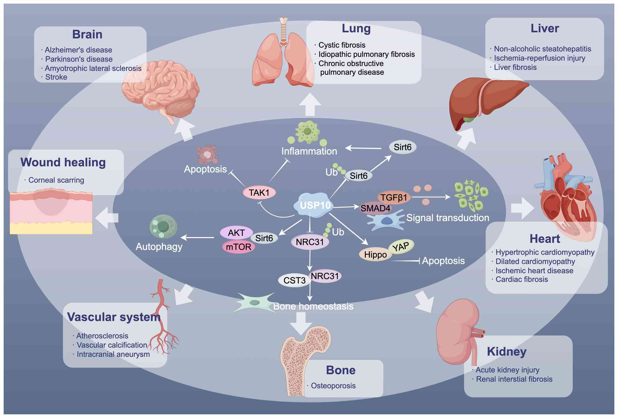 USP10, a multifunctional deubiquitinase, participates in a wide range of physiological processes, including DNA damage repair, immune and inflammatory regulation, environmental adaptation and autophagy. Its ability to modulate diverse substrates, such as p53, AMPK, Beclin1 and ATM, highlights its critical role as a dynamic regulator of cellular stress responses. Furthermore, USP10 acts as a pivotal node in multiple signaling pathways, contributing to both tumor progression and suppression. A broad spectrum of diseases, including cancer, neurodegenerative and infectious diseases and organ fibrosis, have been linked to USP10 dysregulation.