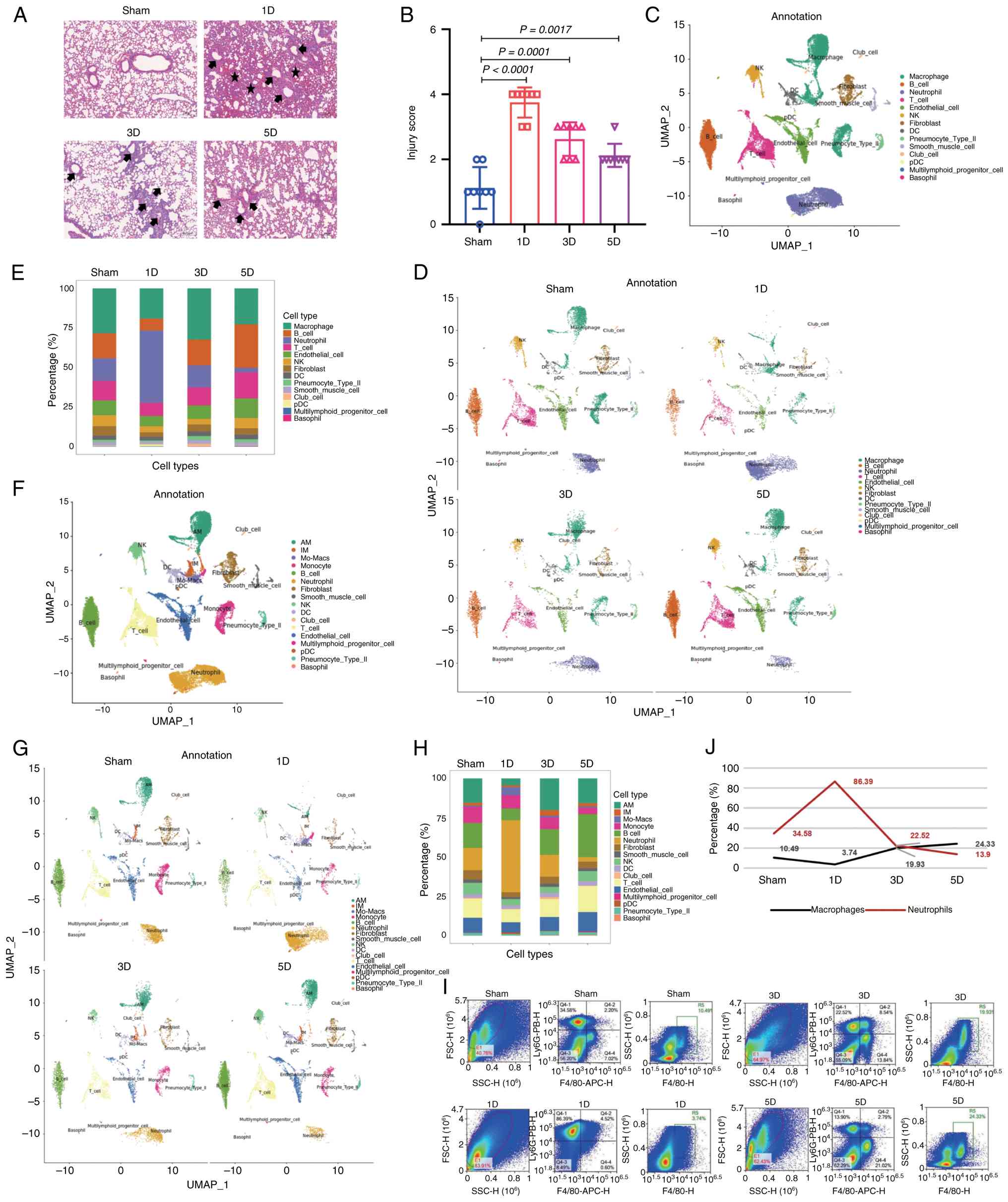 Lungs were harvested and enzymatically dissociated with 0.4 mg/ml collagenase A plus 0.4 mg/ml DNase to yield single-cell suspensions; material from identical time points was pooled. After Fc-blockade (anti-CD16/32, Invitrogen; cat. no. MFCR00), cells were stained with anti-CD45 (BioLegend, Inc.; cat. no. 480027) and CD45+ leukocytes were purified by fluorescence-activated cell sorting for subsequent assays. Using the 10X Genomics Chromium platform (Shanghai OE Biotech Co., Ltd.), barcoded gel beads were loaded to saturation so that each gel bead-in-emulsion (GEMs) contained one cell and one bead. After lysis, poly-A RNA hybridized to the beads, which were then pooled for reverse transcription; every cDNA received a 5′ UMI and a cell-specific barcode. Libraries were checked on a Bioanalyzer 2,100 with an Agilent high-sensitivity DNA chip and quantified by the Qubit HS DNA kit (Q33230; Thermo Fisher, Inc.) before 150-bp paired-end sequencing on a NovaSeq 6,000 (Illumina, Inc.). Reads were demultiplexed and aligned with Cell Ranger 4.0 (10X Genomics, Inc.) under default settings. Gene Ontology (GO) functional enrichment and Kyoto Encyclopedia of Genes and Genomes (KEGG) pathway enrichment analyses of differentially expressed genes were performed with ClusterProfiler (v4.2.0; Shanghai OE Biotech Co., Ltd.). The SRA data are accessible with the following link: https://www.ncbi.nlm.nih.gov/sra/PRJNA1416051.