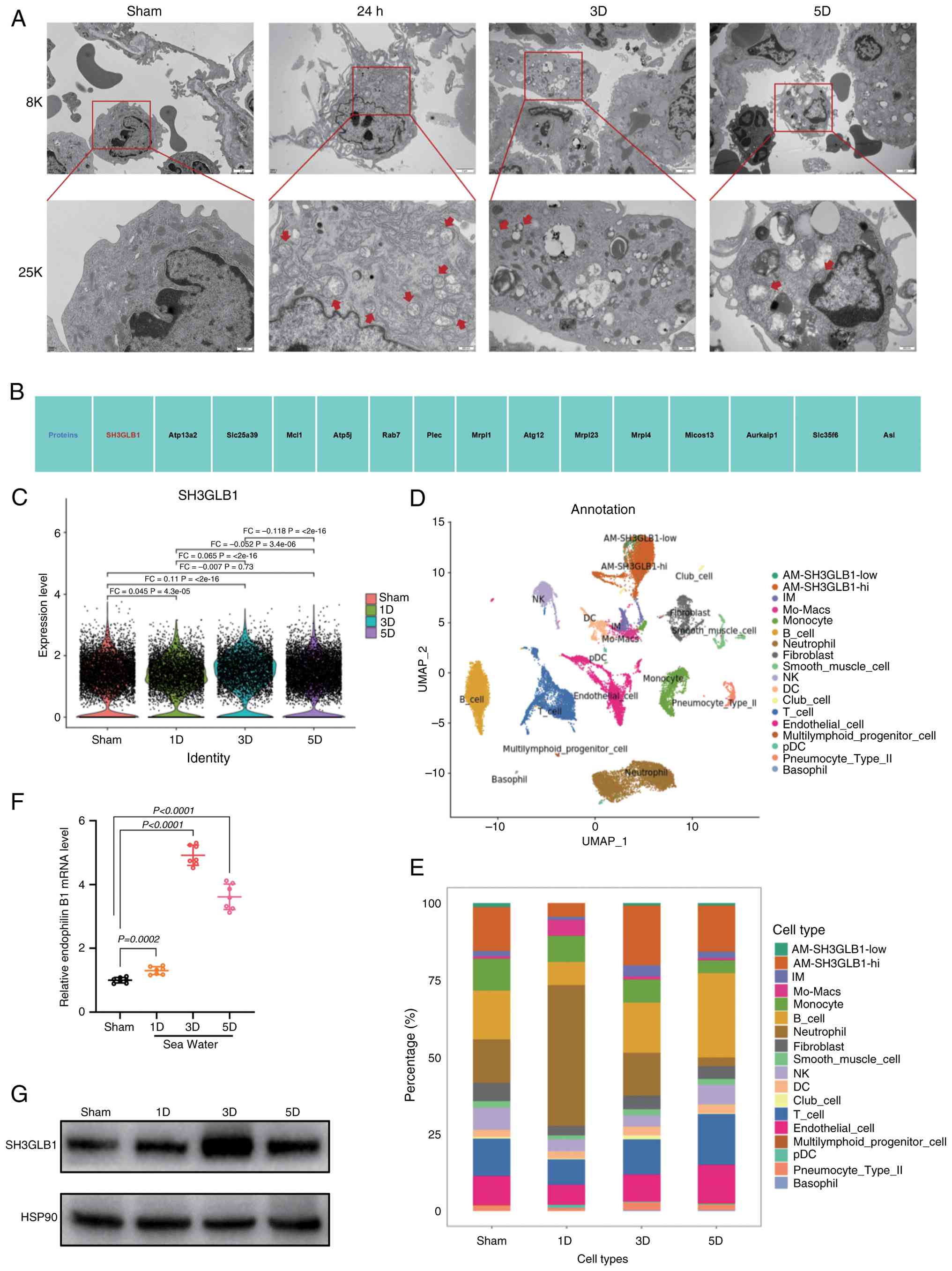 Mitochondria play essential roles in macrophage inflammation during LPS-ALI. Transmission electron microscopy revealed that sea water induced mitochondrial morphological abnormalities, as indicated by greater swelling, a decreased number of mitochondrial cristae and a reduced area of cristae (Fig. 2A). Next, single-cell sequencing data was analyzed and the top 15 mitochondrial proteins identified, among which SH3GLB1 had the highest score (Fig. 2B). Furthermore, it was found that SH3GLB1 was highly expressed in alveolar macrophages and that its expression was highest on the third day of seawater treatment (Fig. 2C). On the basis of the expression of SH3GLB1, the present study subsequently distinguished between alveolar macrophages with high and low expression of SH3GLB1 (Fig. 2D and E). It was found that the alveolar macrophages with high SH3GLB1 expression were depleted on the first day of seawater treatment, increased on the third day and increased on the fifth day. This finding was consistent with the changes in macrophages. To determine the effect of sea water on SH3GLB1, western blotting and qPCR was used to assess its expression. SH3GLB1 expression was elevated in alveolar macrophages treated with seawater (Fig. 2F and G). These results indicated a strong association between increased SH3GLB1 expression and sea water-induced ALI.