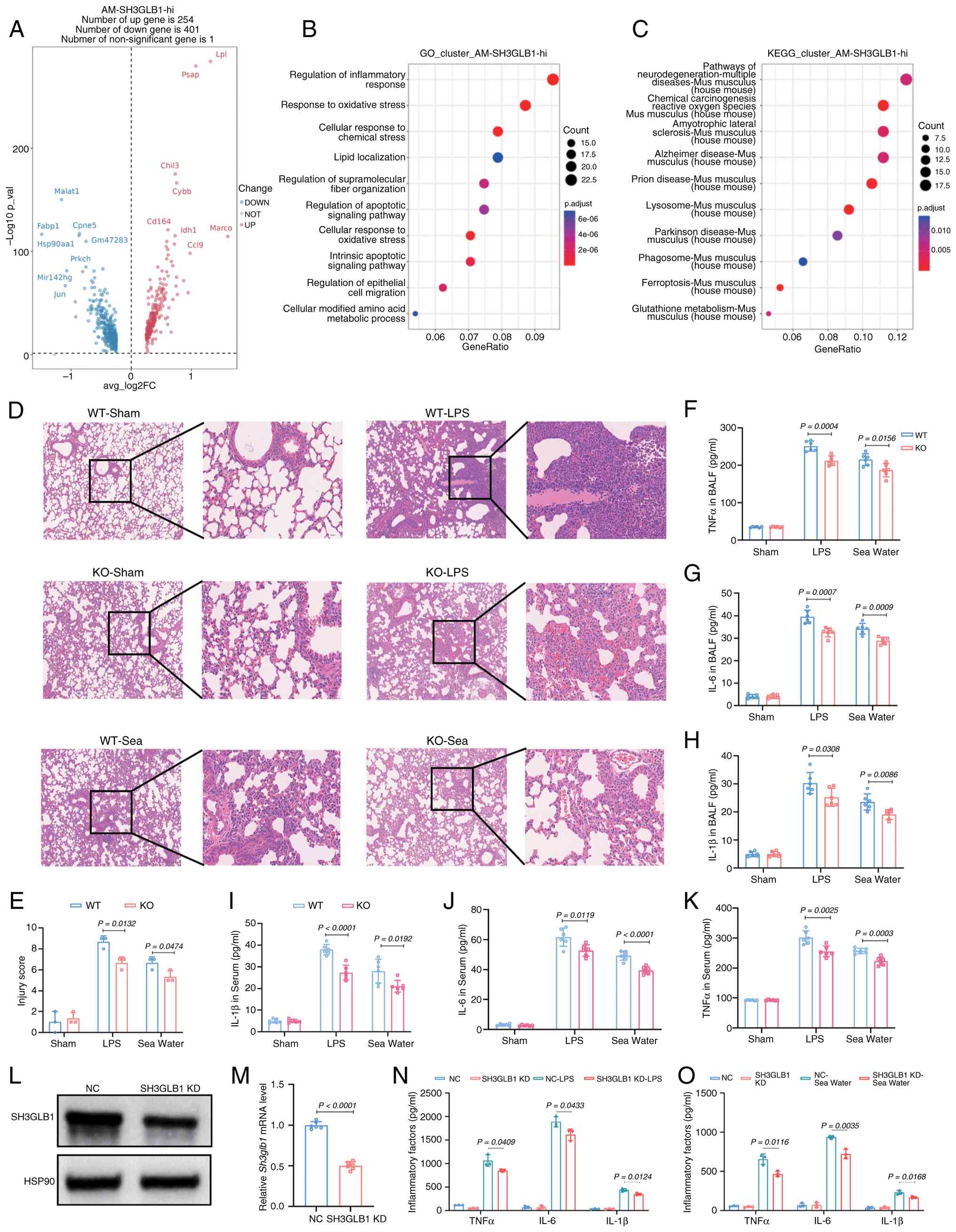 The present study subsequently performed Gene Ontology (GO) and Kyoto Encyclopedia of Genes and Genomes (KEGG) pathway enrichment analyses based on SH3GLB1 expression. The results indicated that SH3GLB1high AMs showed an enrichment in regulation of the inflammatory response and the oxidative stress response (Fig. 3A-C). To assess the effects of SH3GLB1 on ALI, SH3GLB1 KO mice were generated. To gain insight into the function of increased SH3GLB1 in ALI, SH3GLB1 KO and control WT mice were subjected to sea water treatment or a sham operation at 8 weeks of age. Notably, SH3GLB1 deficiency markedly improved sea water-induced ALI and LPS-ALI (Fig. 3D and E). The present study next measured the concentration of inflammatory factors in the BALF via ELISA and found that SH3GLB1 deficiency markedly decreased the sea wateror LPS-induced expression of inflammatory factors, including IL-1β, TNFα and IL-6 (Fig. 3F-H). In agreement with these results, SH3GLB1 deficiency reduced the sea wateror LPS-induced elevations in the serum concentrations of these inflammatory factors (Fig. 3I-K). To determine whether SH3GLB1 defects directly influence macrophage inflammation, we isolated BMDMs and then infected them with adenoviruses carrying siRNA targeting SH3GLB1 or a control scrambled siRNA. Western blot and qPCR analyses revealed that the siRNA effectively knocked down SH3GLB1 expression (Fig. 3L-M). As expected, ELISA analysis demonstrated that SH3GLB1 knockdown in BMDMs markedly reduced the secretion of inflammatory factors induced by LPS (Fig. 3N) and sea water (Fig. 3O). Taken together, the data indicated that SH3GLB1 defects were critical for protection against ALI.