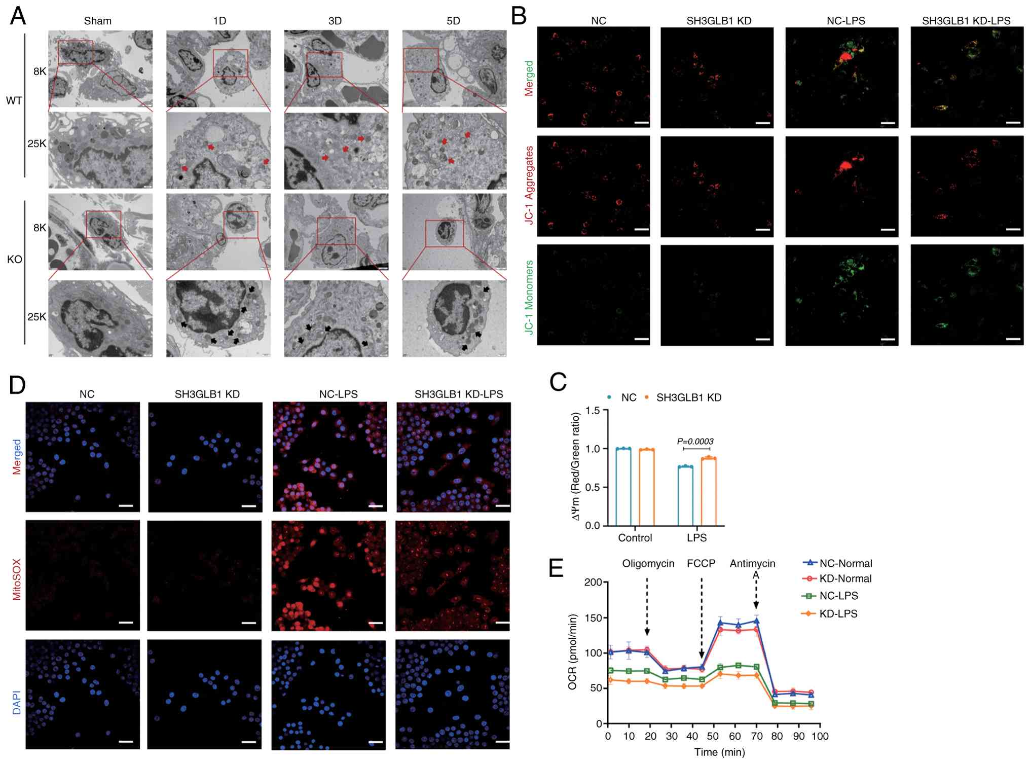 Given that SH3GLB1 deficiency improved BMDM inflammation, it was next determined whether SH3GLB1 can directly affect mitochondrial function in BMDMs. Therefore, the mitochondrial membrane potential was tested using JC-1 staining and it was found that SH3GLB1 knockdown markedly increased the mitochondrial membrane potential in BMDMs under LPS conditions (Fig. 4B and C). Additionally, confocal microscopy images to were used assess mitochondrial ROS levels and it was found that SH3GLB1 knockdown decreased mitochondrial ROS production in BMDMs under LPS conditions (Fig. 4D). Due to these profound alterations in the structure of mitochondria and mitochondrial oxidation, OCR was analyzed to assess mitochondrial respiration. As expected, SH3GLB1 knockdown markedly enhanced mitochondrial respiration in BMDMs under LPS, as shown by basal respiration, ATP production, maximum respiration and reserve respiration (Fig. 4E). Taken together, these data showed that the inactivation of SH3GLB1 increases the potential loss of mitochondrial membrane potential, reduces the generation of mitochondrial ROS and induced by LPS in mitochondrial respiratory failure.