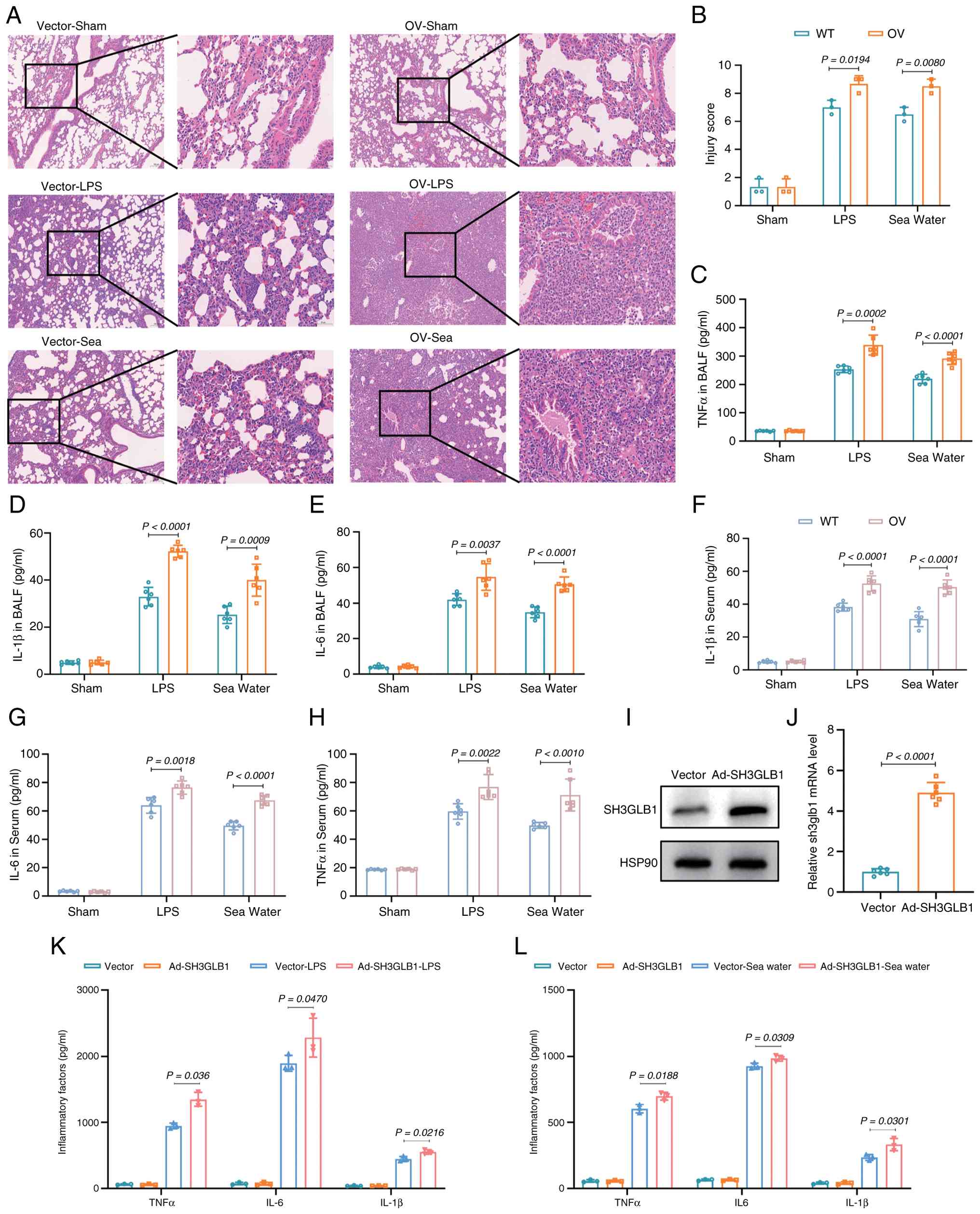 To determine whether SH3GLB1 overexpression can aggravate sea water-induced ALI or LPS-ALI, SH3GLB1 expression was restored by inhalation of adenoviruses expressing the SH3GLB1-GFP fusion protein into the mouse lung. Notably, the hematoxylin and eosin results indicated that SH3GLB1 overexpression markedly aggravated sea water-induced ALI or LPS-ALI (Fig. 5A and B). Furthermore, the present study measured the concentrations of inflammatory factors in the BALF and found that SH3GLB1 overexpression markedly increased the sea wateror LPS-induced expression of inflammatory factors (Fig. 5C and E). Similarly, SH3GLB1 overexpression increased sea water or LPS-induced increases in the serum concentrations of these inflammatory factors (Fig. 5F-H). Next, SH3GLB1 was overexpressed in BMDMs via adenovirus infection. Western blot and qPCR analyses revealed markedly increased expression of SH3GLB1 in BMDMs (Fig. 5I and J). ELISAs revealed that SH3GLB1 overexpression in BMDMs markedly promoted the secretion of inflammatory factors induced by LPS (Fig. 5K) and sea water (Fig. 5L). Overall, the data revealed that restoring SH3GLB1 expression in the lung exacerbated ALI.
