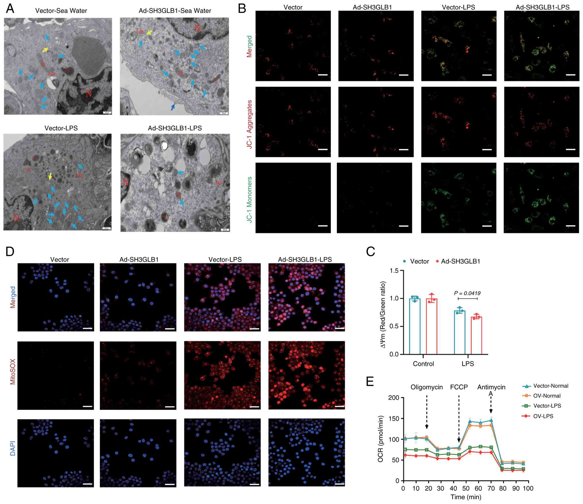 Next, alveolar macrophages (AMs) mitochondrial morphology was examined using TEM in SH3GLB1overexpressing and control mice at 8 weeks of age. No significant alterations in mitochondrial morphology were observed in SH3GLB1-overexpressing mice compared with control mice. However, SH3GLB1 overexpression provoked mitochondrial morphological abnormalities, as indicated by increased swelling, an increased number of mitochondrial cristae and an increased area of cristae induced by sea water or LPS (Fig. 6A). The present study also found that SH3GLB1 expression markedly decreased the mitochondrial membrane potential in BMDMs under LPS conditions (Fig. 6B and C). Additionally, confocal microscopy images indicated that SH3GLB1 overexpression increased mitochondrial ROS production in BMDMs under LPS conditions (Fig. 6D). The present study analyzed the mitochondrial OCR to assess the mitochondrial respiratory capacity. SH3GLB1 overexpression markedly reduced mitochondrial respiratory capacity, as indicated by basal respiration, ATP production, maximal respiration and spare respiration, in BMDMs under LPS conditions (Fig. 6E). Taken together, these data demonstrated that SH3GLB1 overexpression facilitated mitochondrial membrane potential loss and increased mitochondrial ROS production and mitochondrial respiratory dysfunction induced by LPS.