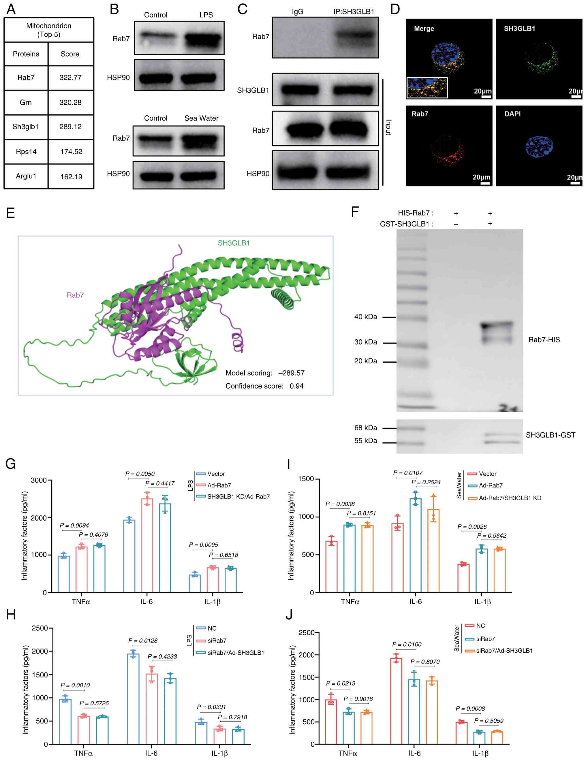 To understand the molecular mechanisms of SH3GLB1 in macrophage function, IP-LC-MS/MS was employed to identify potential endogenous SH3GLB1 binding partners with a specific antibody against SH3GLB1 in BMDMs. The top 5 mitochondrial proteins were identified, among which Rab7 had the highest score (Fig. 7A). LPS or sea water increased Rab7 expression in BMDMs (Fig. 7B). Co-IP assays revealed that SH3GLB1 interacted with the lysosomal protein Rab7 (Fig. 7C). Moreover, immunofluorescence staining of BMDMs was performed and the colocalization of SH3GLB1 and Rab7 was observed (Fig. 7D). The present study subsequently conducted molecular docking analysis, which revealed a docking score of -289.57, which is less than -1 and the confidence score was 0.94 (a score higher than 0.7 indicated that Rab7 was more likely to bind to SH3GLB1) (Fig. 7E). The results of the pull-down experiments indicated that the purified Rab7 interacted with SH3GLB1 in vitro (Fig. 7F). These results suggested the direct binding between SH3GLB1 and Rab7. To determine whether SH3GLB1 promotes inflammation through Rab7, BMDMs were subjected to Rab7 overexpression or SH3GLB1 knockdown. The results revealed that the overexpression of Rab7 followed by the knockdown of SH3GLB1 failed to improve the release of inflammatory factors in BMDMs induced by LPS or sea water (Fig. 7G and I). Similarly, Rab7 knockdown followed by SH3GLB1 overexpression failed to change the release of inflammatory factors induced by LPS or sea water (Fig. 7H and J). These findings indicated that SH3GLB1 was required for Rab7 to contribute to macrophage inflammation.
