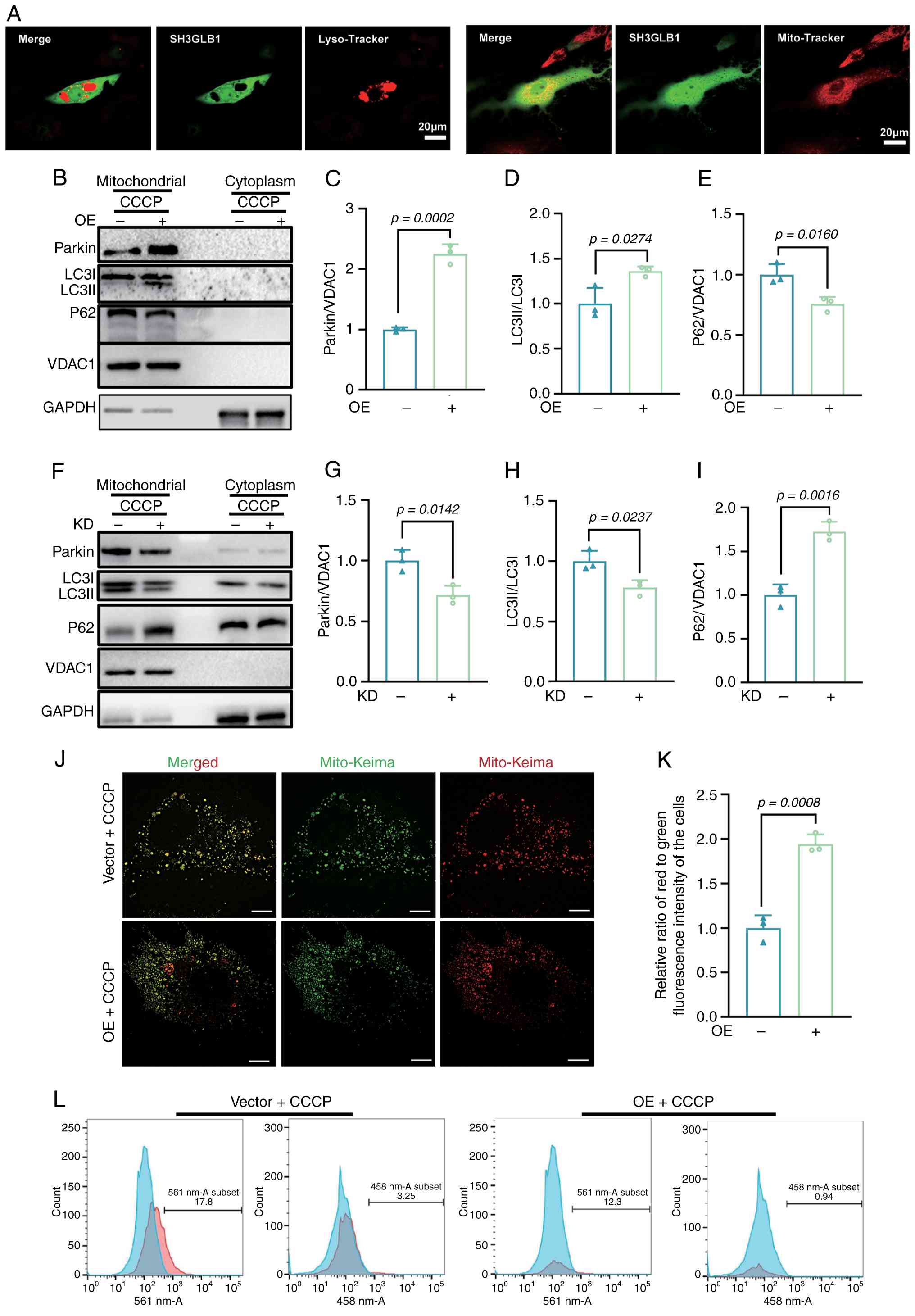 To clarify the localization of SH3GLB1 in BMDMs, immunofluorescence staining was performed and the colocalization of SH3GLB1 with lysosomes (labelled with LysoTracker) and mitochondria (labelled with MitoTracker) was observed (Fig. 8A). Rab7 plays a crucial role in the interaction between mitochondria and lysosomes, participating in the formation and fusion of mitochondrial autophagosomes, as well as in the contact and dissociation processes between mitochondria and lysosomes. To investigate whether SH3GLB1 is involved in Rab7-mediated mitophagy, cells overexpressing SH3GLB1 were treated with the mitochondrial autophagy inducer carbonyl cyanide-chlorophenylhydrazone and the overexpression of SH3GLB1 markedly increased the expression of the mitophagy-related proteins Parkin and LC3 while decreasing the expression of P62 (Fig. 8B-E). Additionally, mKeima expressed in BMDMs was imaged by confocal microscopy and assayed by flow cytometry. As shown in Fig. 8J and L, the overexpression of SH3GLB1 markedly facilitated mitophagy. However, SH3GLB1 knockdown decreased the expression of the mitophagy-related proteins Parkin and LC3 while decreasing the expression of P62 (Fig. 8F-I). Taken together, these findings indicated that SH3GLB1 facilitated adverse Rab7-mediated mitophagy.