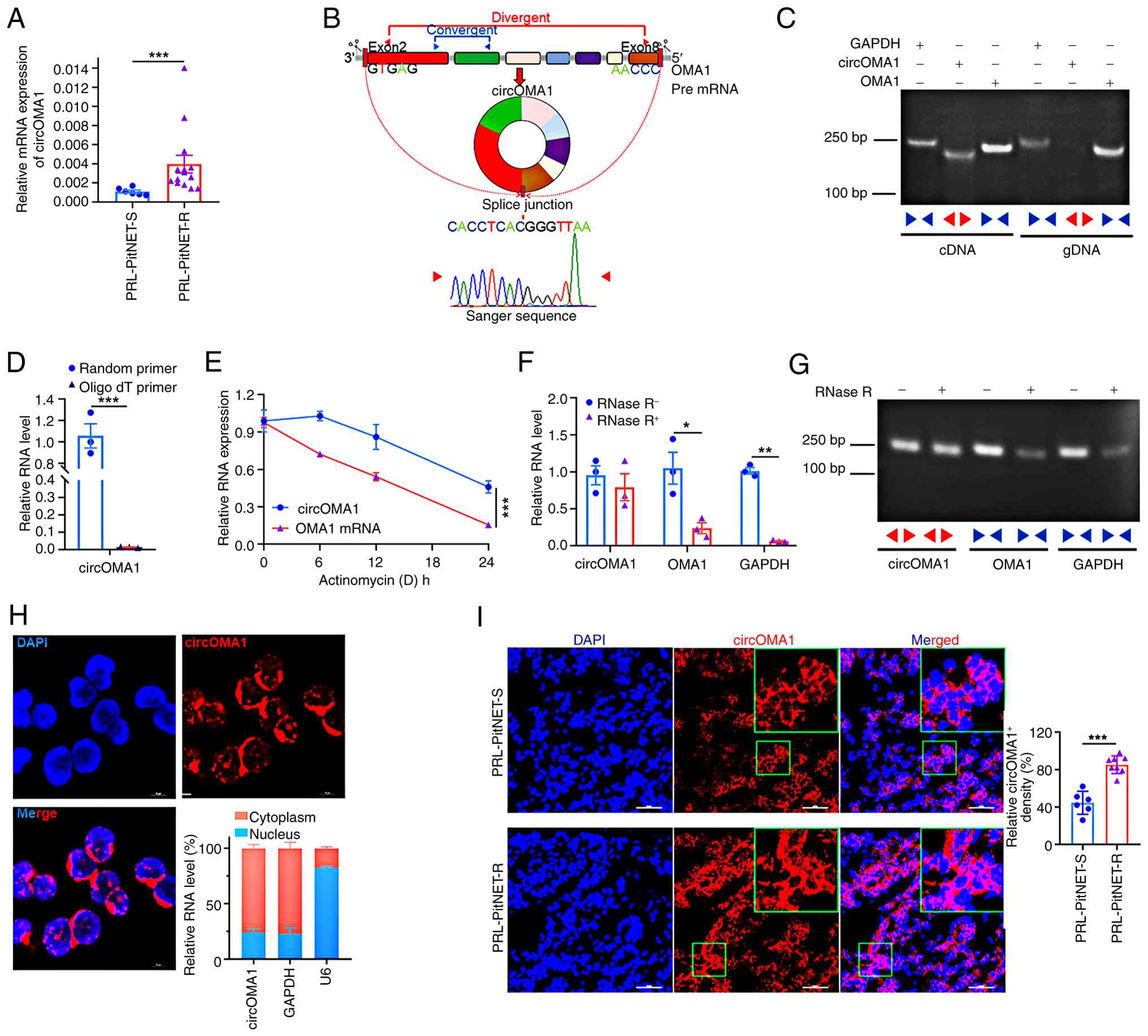 circOMA1 (hsa_circ_0002316) is a 1,381bp transcript generated by back-splicing of exons 2-8 of the OMA1 gene. Its head-to-tail splice junction was confirmed by RT-qPCR and Sanger sequencing (Fig. 1B). Specific amplification of the splice junction occurred only with cDNA templates derived from circOM cells, not with genomic DNA (gDNA) templates (Fig. 1C). Furthermore, circOMA1 was amplified using random primers but not oligo(dT) primers, confirming it lacked a polyadenylated tail (Fig. 1D). To assess stability, circOM cells were treated with actinomycin D (an RNA synthesis inhibitor). circOMA1 demonstrated significantly greater stability compared with linear OMA1 mRNA (Fig. 1E). Additionally, circOMA1 exhibited resistance to RNase R digestion (which degrades linear RNA), while GAPDH and linear OMA1 mRNA were degraded, as confirmed by RNase R assay and agarose electrophoresis (Fig. 1F and G). Collectively, these results confirmed the successful generation of MMQ cell lines overexpressing circOMA1 and validated its circular nature and stability. To determine circOMA1 localisation, FISH and subcellular fractionation were performed. Both methods revealed predominant cytoplasmic distribution of circOMA1 in circOM cells (Fig. 1H). Consistent with this, FISH analysis of PRL-PitNET-S and PRL-PitNET-R tissues showed circOMA1 localisation patterns similar to those observed in circOM cells (Fig. 1I).