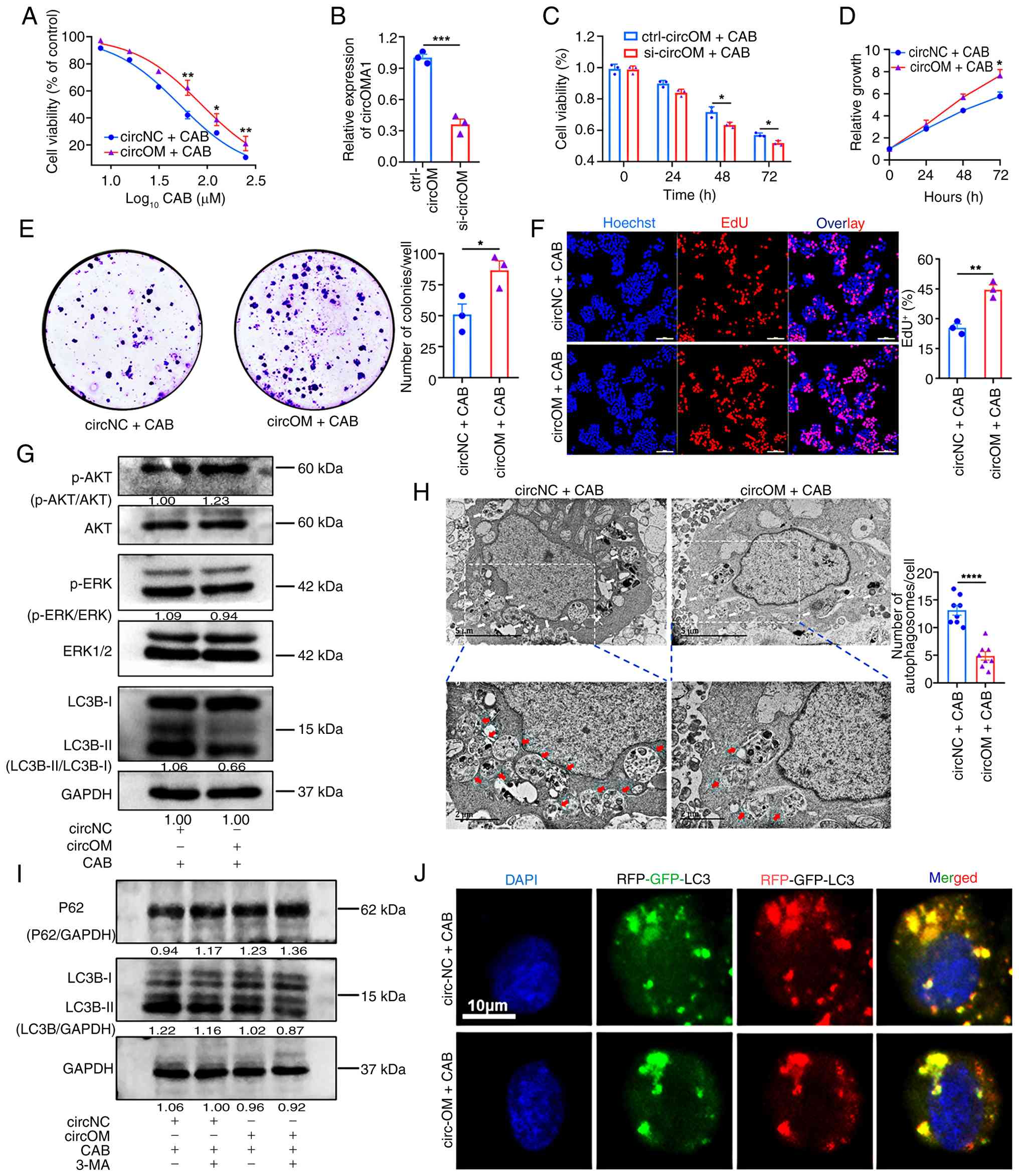 Finally, to determine if exosomal circOMA1 confers CAB resistance, purified circOM-EXO or circNC-EXO were directly co-cultured with MMQ cells. circOM-EXO significantly reduced the sensitivity of parental MMQ cells to CAB (Fig. 5G). Consistent with this functional transfer of resistance, EdU incorporation and colony formation assays yielded similar results (Fig. S6A and B).