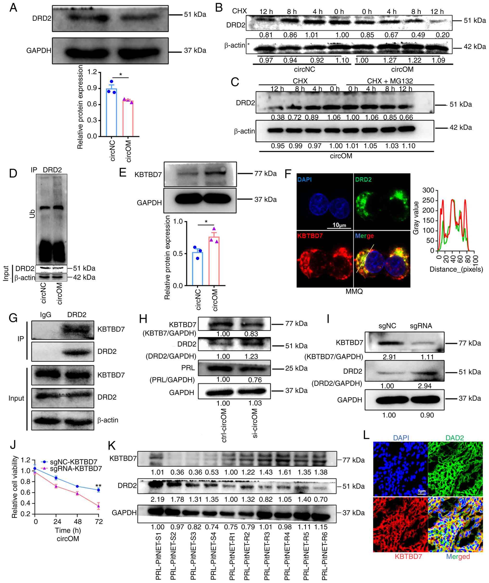 Previous studies have established that reduced expression or activity of DRD2 is a major cause of drug resistance in PRL-PitNET (8-11). Thus, whether circOMA1 promoted CAB resistance by regulating DRD2 was next assessed. The results showed that DRD2 protein levels were decreased in circOM (Fig. 3A), but its mRNA levels were not (Fig. S1F). Previous research identified that KBTBD7 [a substrate adaptor for the CUL3-RING ubiquitin (Ub) ligase complex] can specifically bind GABARAP proteins, ubiquitylate TIAM1 (40), and promote the ubiquitination of DRD2 (36). In the present study, accelerated degradation of DRD2 in circOM cells was observed following treatment with the protein synthesis inhibitor CHX (Fig. 3B), while accelerated degradation was reversed by co-treatment with the proteasome inhibitor MG132 (Fig. 3C). Furthermore, Co-IP assays revealed significantly increased ubiquitination of DRD2 protein in circOM cells (Fig. 3D). Similarly, KBTBD7 protein levels were markedly elevated in circOM (Fig. 3E). Subsequent immunofluorescence analysis of MMQ cells demonstrated cytoplasmic co-localisation of KBTBD7 and DRD2 (Fig. 3F), and Co-IP confirmed their physical interaction (Fig. 3G). Knocking down circOMA1 in circOM cells downregulated KBTBD7 and PRL expression while concomitantly upregulating DRD2 levels (Fig. 3H). To further elucidate whether circOMA1 regulated DRD2-mediated resistance specifically through KBTBD7, KBTBD7 expression was knocked out using CRISPR/Cas9 in circOM cells. This resulted in a significant increase in DRD2 expression (Fig. 3I and S2A-C), and a reversal of CAB resistance (Fig. 3J). Collectively, these findings indicated that circOMA1 induced CAB resistance by enhancing KBTBD7 expression, which in turn promoted DRD2 ubiquitination and degradation. Finally, in prolactinoma tissues, KBTBD7 expression was markedly higher in CAB-resistant (PRL-PitNET-R) cases than in controls, whereas DRD2 expression showed the opposite trend (Fig. 3K). Immunofluorescence also confirmed their co-localisation in the cytoplasm of these tumour tissues (Fig. 3L).
