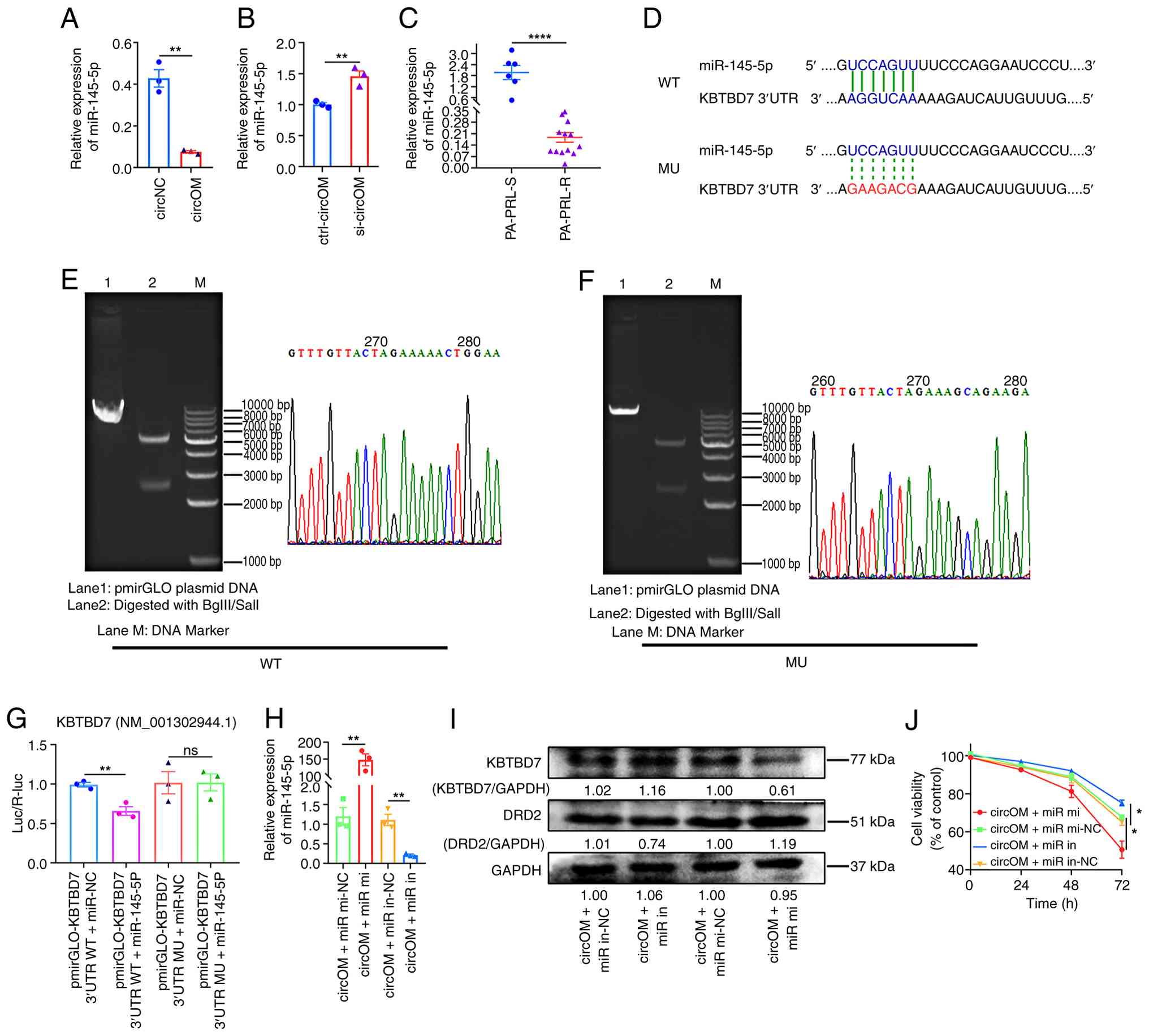 To further investigate whether circOMA1 induced CAB resistance via the miR-145-5p/KBTBD7 axis regulating DRD2, miR-145-5p levels were modulated in circOM cells. Overexpression of miR-145-5p significantly downregulated KBTBD7, upregulated DRD2, and enhanced CAB sensitivity in circOM cells. Conversely, knockdown of miR-145-5p produced the opposite effects (Fig. 4H-J). These results demonstrated that circOMA1 promoted CAB resistance by acting as a miR-145-5p sponge, thereby alleviating miR-145-5p-mediated repression of KBTBD7. Elevated KBTBD7 subsequently enhanced DRD2 ubiquitination and degradation, ultimately leading to drug resistance.