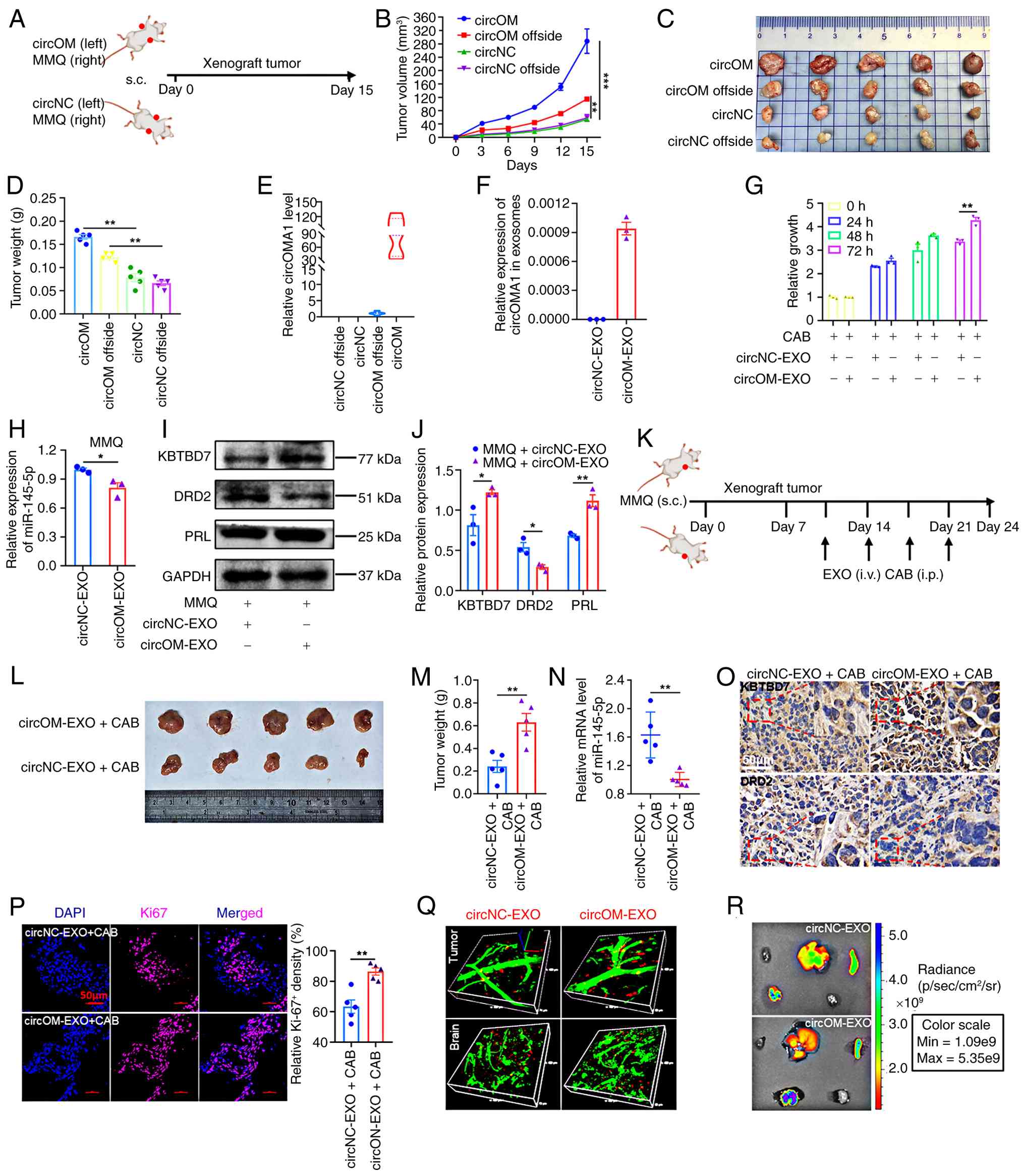 To validate the in vivo relevance of this exosome-mediated resistance transmission via the miR-145-5p/KBTBD7/DRD2 axis, a xenograft tumour model was used. MMQ cells were subcutaneously inoculated into the right flanks of 4-6-week-old female BALB/c nude mice. Starting at day 10, mice received intravenous injections of circOM-EXO or circNC-EXO via the tail vein twice weekly for 2 weeks, combined with CAB treatment. Mice were euthanised on day 24 (Fig. 5K). The results demonstrated that circOM-EXO significantly enhanced tumour resistance to CAB, resulting in larger tumours and higher tumour weights in the circOM-EXO group compared with controls (Fig. 5L and M). Supporting the proposed axis, miR-145-5p levels were significantly decreased (Fig. 5N), and IHC revealed markedly elevated KBTBD7 protein expression alongside reduced DRD2 protein in circOM-EXO-treated tumours (Fig. 5O). Further corroborating the pro-tumorigenic role, circOM-EXO treatment considerably enhanced tumour cell proliferation, as evidenced by higher Ki-67 expression (Fig. 5P), and elevated levels of Pit-1 and PRL (Fig. S6H and I).