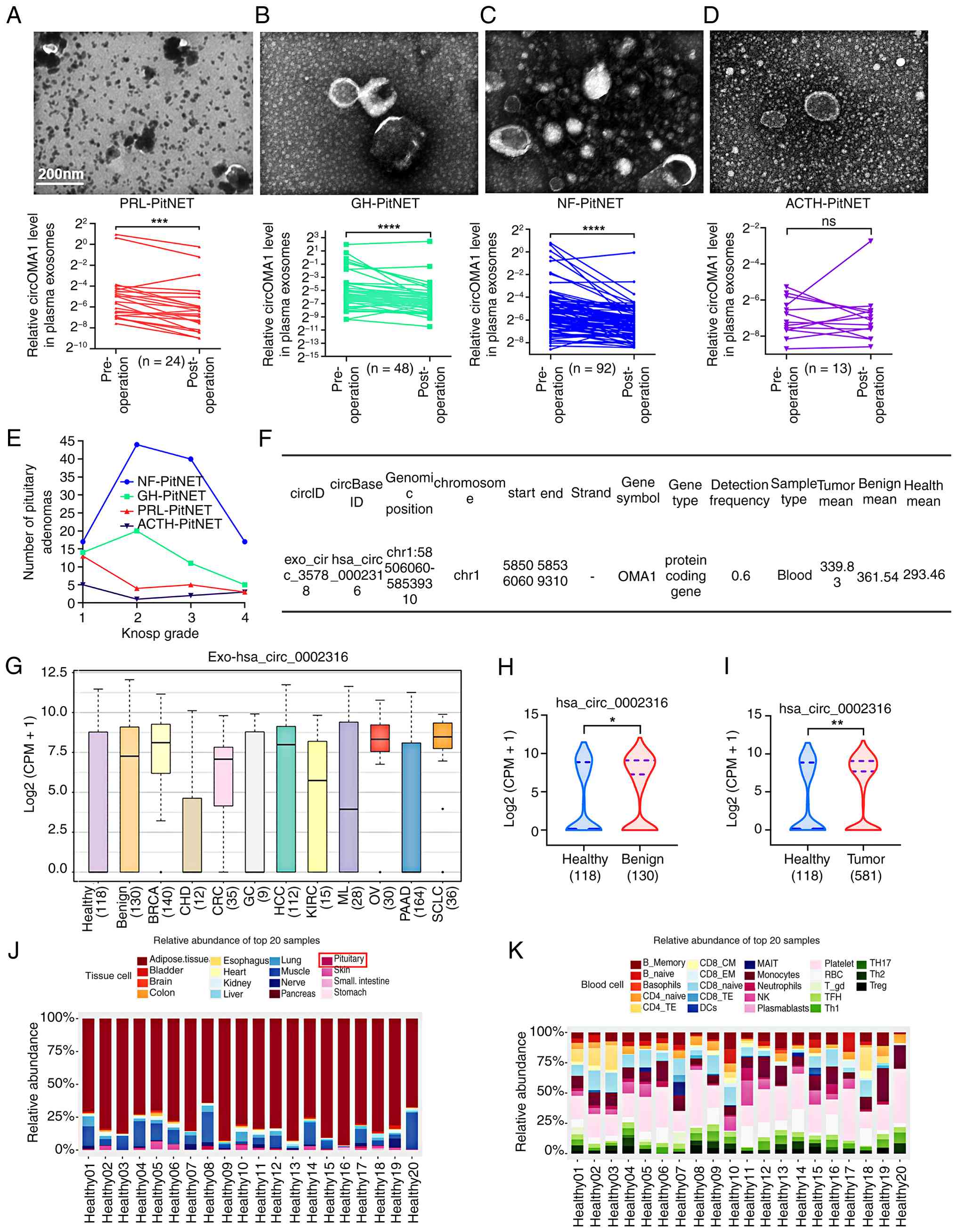 Exosomes represent an emerging, clinically promising detection modality, often referred to as a 'liquid biopsy.' This approach offers operational convenience and reduced patient discomfort compared with traditional tissue biopsy. In the present study, plasma exosomal circOMA1 levels generally decreased significantly following surgery in patients with a PitNET. Conversely, recurrent patients exhibited markedly elevated levels prior to a second surgery. This pattern likely reflects the reduction or absence of tumour-derived exosomal circOMA1 post-resection, with the decline being more pronounced in patients with longer postoperative intervals. Statistical analysis was not possible for certain patients due to the lack of pre- or post-operative blood samples. Furthermore, elevated blood exosomal circOMA1 expression was commonly observed across a range of other tumour types, while exhibiting relatively high abundance in the pituitary glands of healthy individuals. The relatively high expression of circOMA1 in pituitary tissues, along with its abnormally elevated expression in PRL-PitNETs, suggests that, in rat prolactinoma models, delivering circOMA1 knockdown molecules via exosomes may reduce circOMA1 expression in prolactinoma tissues to a lower level, potentially allowing for improved tumour control. Moreover, exoRBase database analysis reveals that circOMA1 is highly abundant in human platelets in peripheral blood, suggesting that platelet-derived exosomes may represent a feasible approach for identifying prognostic markers.