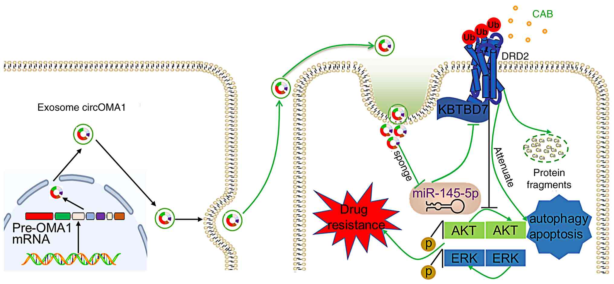 In conclusion, the results of the present study demonstrated that exosomal circOMA1 is crucial in the development and propagation of CAB resistance in PRL-PitNET. It was shown that circOMA1 regulates DRD2 via the miR-145-5p/KBTBD2 axis, thereby impairing downstream autophagy and inhibiting AKT pathway suppression, ultimately leading to CAB resistance. Furthermore, circOMA1 is transported by exosomes, facilitating the transmission of CAB resistance among MMQ cells both in vitro and in vivo (Fig. 7). Analysis of a large cohort of PitNETs samples suggested the potential of exosomal circOMA1 as a prognostic biomarker.