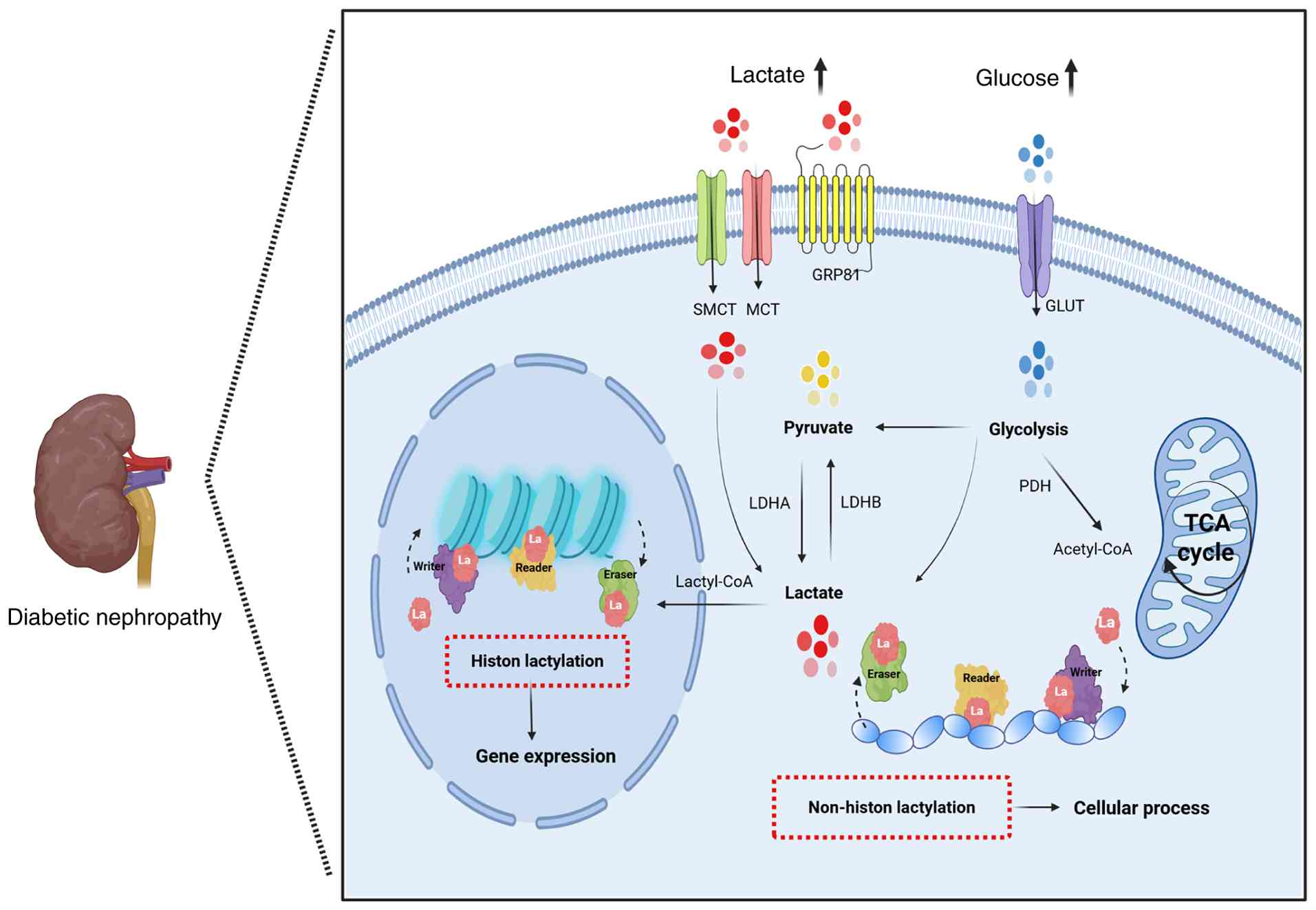 DN is characterized by long-term exposure of renal cells, particularly podocytes and tubular epithelial cells, to a high-glucose, high-lactate microenvironment, and has been associated with elevated lactate to increased histone lactylation, epithelial-mesenchymal transition (EMT), inflammation and fibrosis in diabetic kidneys. Under such sustained conditions, non-enzymatic lactylation of histone and non-histone proteins could serve as a relatively slow-turnover 'molecular archive' of prior metabolic states, thereby contributing to the phenomenon of metabolic memory in DN, but this hypothesis has yet to be rigorously tested in vivo and should be interpreted with caution (23,24,68,79).