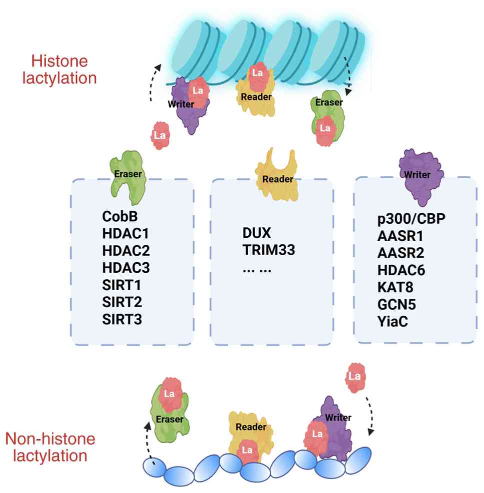 Enzymatic lactylation modifications are predominantly regulated by histone acetyltransferases and HDACs. Currently, several lactyl-CoA transferases, also called writers, have been documented in mammals, including p300/CBP (60), KAT8 (61), general control of amino acid synthesis 5 (GCN5) (62), the GCN5-related N-acetyltransferase (GNAT) family protein YiaC and mitochondrial alanyl-tRNA synthase 1/2 (AARS1/2) (51). Conversely, LDHs, also called 'erasers', include mainly the NAD-dependent protein deacetylases CobB (63), HDAC1-3, SIRT1-3 (64). To the best of our knowledge, studies on non-enzymatic lactylation modifications are relatively rare, and further investigations are warranted (Fig. 3).