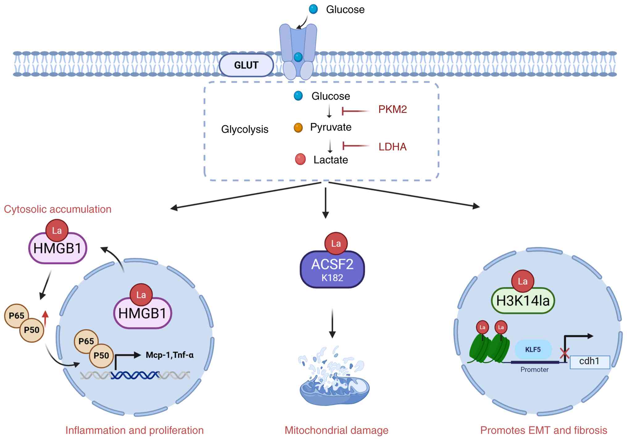 Studies assessing the implications of histone lactylation in the onset and development of DN are rare. Nevertheless, Zhang et al (77) reported that H3K14 lactylation may be involved in DN through the regulation of EMT. The researchers discovered that AGE-dependent induction of renal tubular epithelial cells (RTECs) increased kidney lactate levels, and that reducing lactate levels could notably hinder EMT progression and ameliorate renal tubular fibrosis in DN. Mechanistically, lactate can upregulate histone 3 lysine 14 lactylation (H3K14la) in DN. Further ChIP-sequencing (seq) and RNA-seq data indicated that histone lactylation is involved in EMT by upregulating Krüppel-like factor 5 (KLF5).