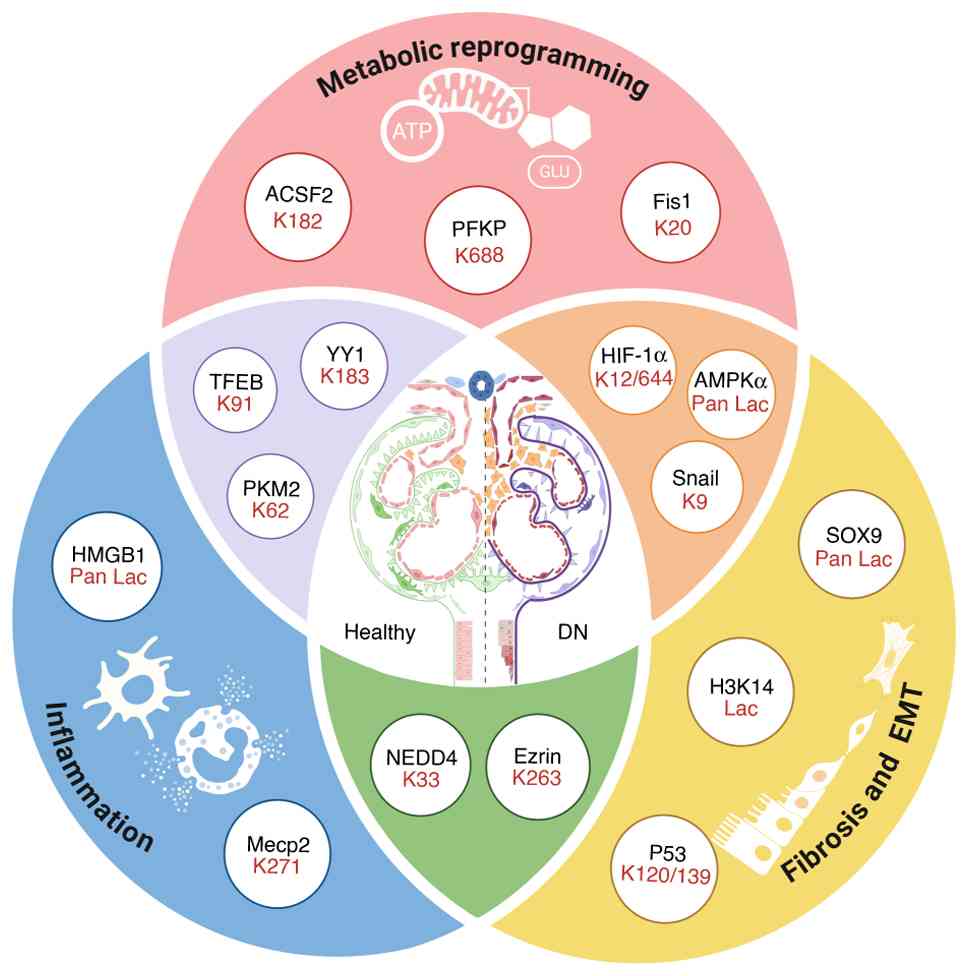 In conclusion, the present review summarizes lactylation and key regulatory molecules during the progression of DN, with a focus on the relationship between lactylated non-histone proteins and DN. Currently, few drugs target lactylation for the treatment of metabolic diseases, especially DN. The limited availability of potential treatments is related to the small numbers of druggable targets and drugs identified to date, as well as the incomplete understanding of lactylation or its regulatory mechanisms. Once these issues are effectively addressed, the use of lactylation as a target for DN treatment would be feasible.