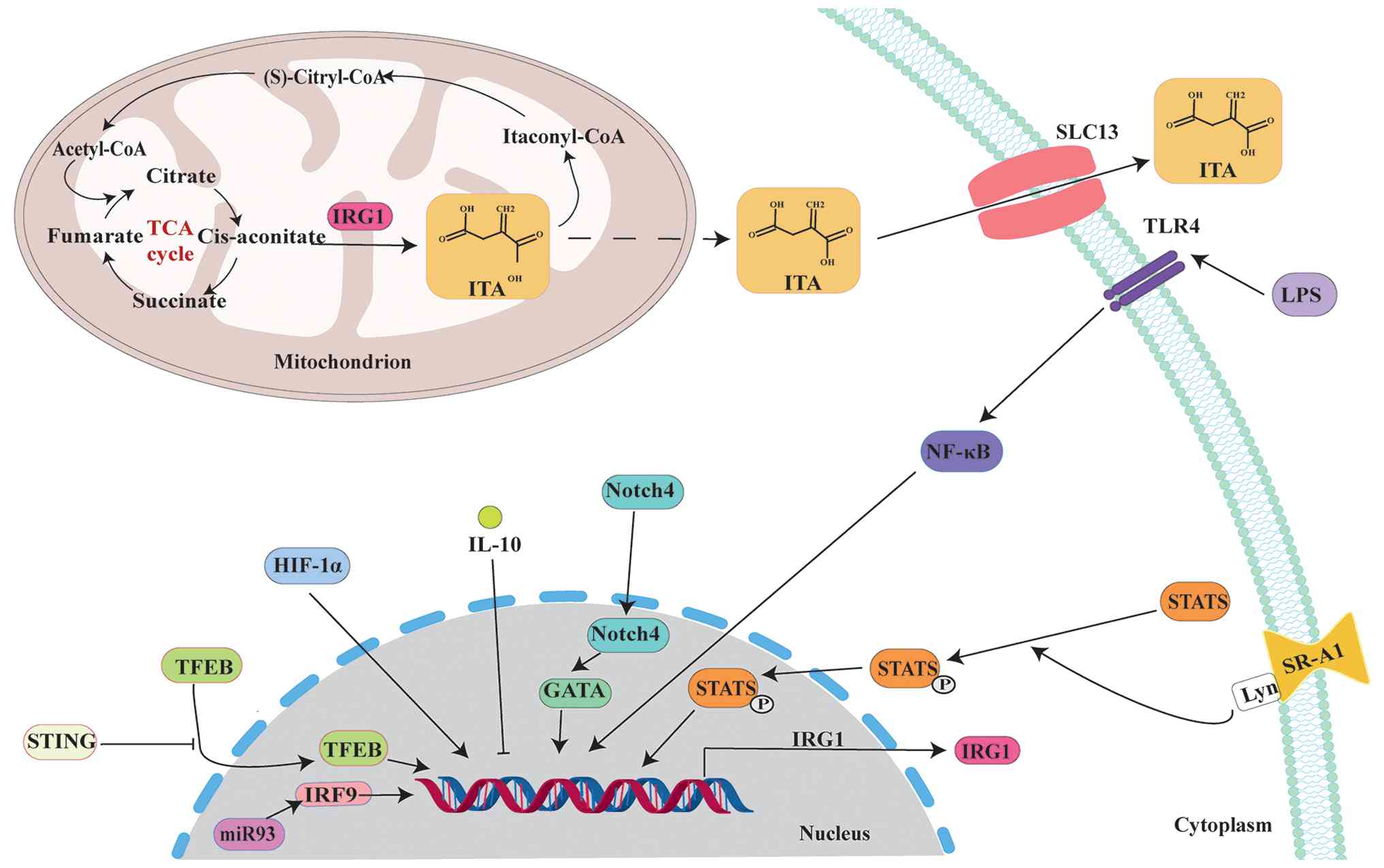 As a key regulator of ITA synthesis, IRG1 expression is modulated by multiple signalling pathways. LPS activates NF-κB signalling via toll-like receptor 4, directly inducing IRG1 transcription and promoting ITA production (35). Hypoxia-inducible factor-1α (HIF-1α) also increases IRG1 expression, further stimulating ITA generation (39). Type I IFN suppresses IRG1 expression via IL-10, reducing ITA synthesis in macrophages (40). Absolute or relative deficiency of microRNA-93 in hypoxic, serum-starved macrophages leads to increased IFN regulatory factor 9-IRG1 expression, resulting in elevated ITA production (41). Additionally, the neurogenic locus notch homologue 4 (NOTCH4)/GATA binding protein (GATA)/IRG1, scavenger receptor A1/STAT3/IRG1 and lysosomal biogenesis factor transcription factor EB (TFEB)/IRG1 pathways (42-44) also regulate ITA synthesis.