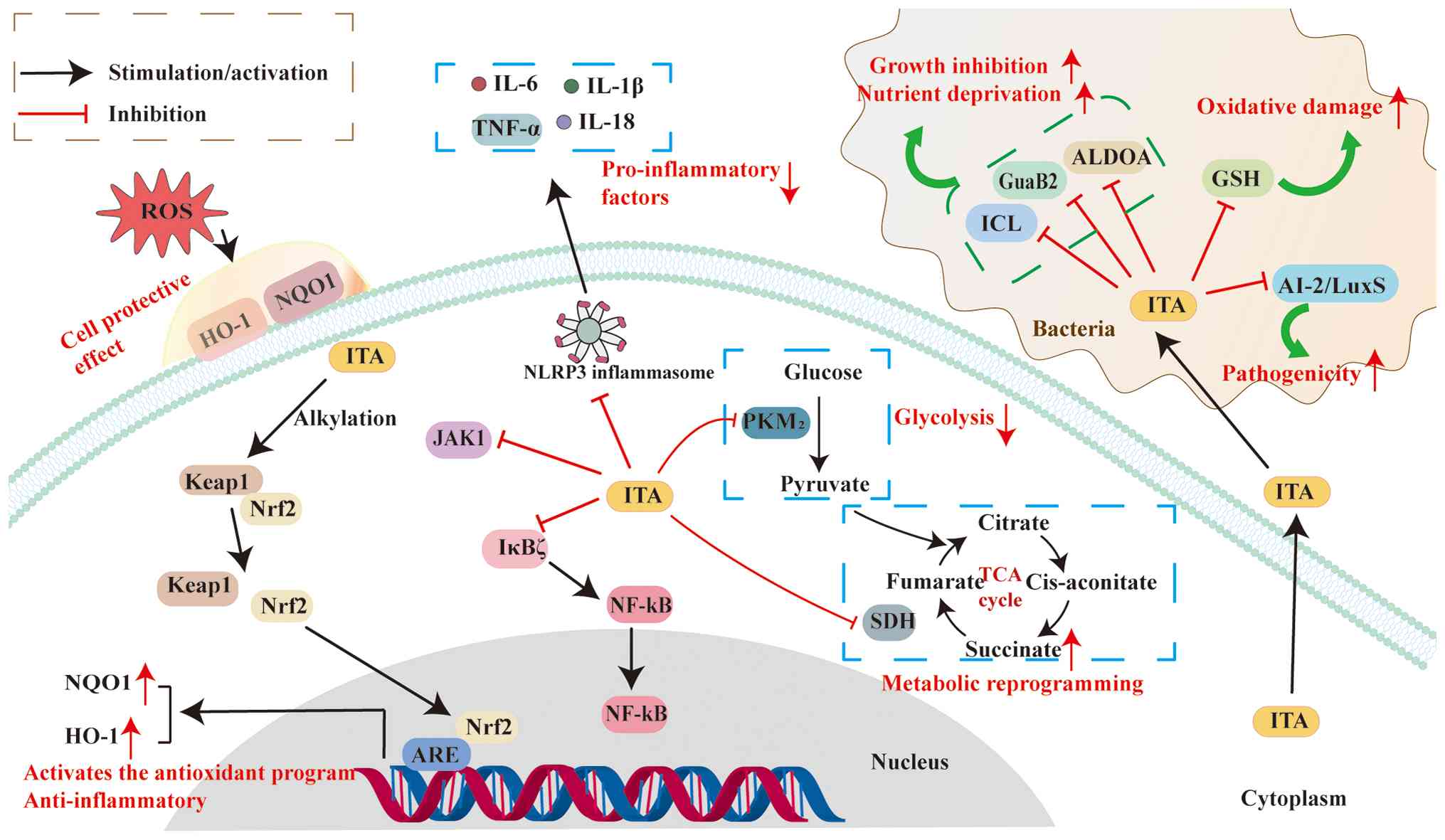 The autoinducer-2 (AI-2)/S-ribosylcysteine synthase (LuxS) regulatory system governs multiple key bacterial functions, including virulence expression, biofilm formation and motility (80). ITA decreases bacterial pathogenicity by inhibiting the AI-2/LuxS system and virulence-associated gene expression (81,82). Notably, ITA also disrupts bacterial membrane integrity and exacerbates oxidative damage, further demonstrating its antibacterial effects (81). ITA depletes the antioxidant glutathione (GSH) within bacteria; reduced GSH levels impair bacterial resistance to host-generated reactive oxygen species (ROS) attacks (83), increasing bacterial susceptibility to oxidative stress damage. Lysosomes serve as the primary organelles by which macrophages eliminate invading bacteria (84). As a lysosome inducer, ITA enhances the antimicrobial capacity of macrophages (85). Furthermore, ITA impairs the cytotoxicity of Plasmodium parasites (66), further demonstrating its antibacterial effects.