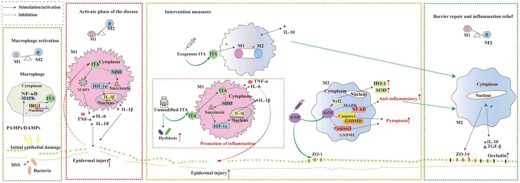 ITA originates from the immune responses and may exhibit low toxicity, providing a potential basis for its clinical application (24). A preliminary in vitro toxicity study indicated that neither ITA nor DI significantly affects macrophage viability at a concentration of 10 mM (98). Further a short-term animal study reveals no marked pathological alterations in liver or kidney tissue following intraperitoneal administration of 4-OI (40 mg/kg/day for 3 consecutive days) in mice (139). However, these data are insufficient to define organ-specific toxicity, maximum tolerated dose or risk of interactions with other drugs during long-term administration (12,140,141). Given the extensive involvement of the ITA pathway in cell metabolism, the risk of interactions between its derivatives and other drugs, particularly those utilising similar metabolic pathways or affecting immune function, warrants urgent evaluation. Coadministration of 4-OI significantly enhances the therapeutic efficacy of mesalazine in UC (96), offering a novel option for patients who are resistant to conventional therapies. Future research should focus on elucidating the regulatory role of 4-OI in the gut microbiota-immune axis and exploring synergistic effects when combined with traditional drugs or biological agents, thereby pioneering new avenues for precision treatment of IBD.