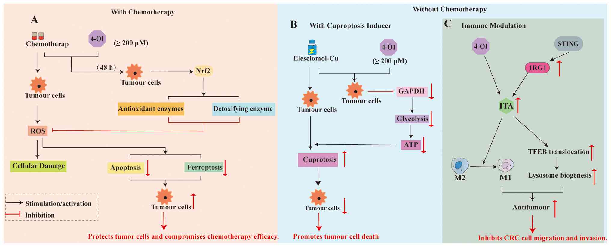 Chemotherapy is a key therapeutic modality following surgery for advanced CRC, with sensitivity to chemotherapeutic agents serving as a primary determinant of treatment efficacy (115). Nrf2 modulates multiple antioxidant and detoxification pathways, thereby mitigating cell damage induced by chemotherapeutic drugs (116). 4-OI is an Nrf2 activator (117). Huang et al (19) demonstrated that treating HCT-116 and LOVO cells with 200 μM 4-OI in combination with oxaliplatin (30 μM) or lobaplatin (16 μg/ml) for 48 h significantly attenuates the cytotoxic effects of these chemotherapeutic agents, resulting in enhanced CRC cell survival. Mechanistic analysis has revealed that under these conditions, 4-OI effectively decreases chemotherapy-induced ROS levels by activating the Nrf2 pathway, thereby inhibiting apoptosis and ferroptosis and protecting tumour cells (19,116). Yang et al (118) reported that treatment of HCT116 and LOVO cells with 4-OI at 100, 200 or 300 μM alone does not affect cell viability. However, when 200 or 300 μM 4-OI is combined with copper death inducers such as elesclomol-Cu, cell death is promoted. The higher the 4-OI concentration, the stronger the sensitising effect on copper-induced death, with the 300 μM 4-OI + elesclomol-Cu group exhibiting significantly higher cell death rate than the 200 μM combination group. This effect has been validated in vivo: In a nude mouse xenograft model, the tumour suppression efficacy of the combined treatment with elesclomol-Cu (10 mg/kg) and 4-OI (50 mg/kg) surpasses that of elesclomol-Cu monotherapy; mechanistic analysis has revealed that 4-OI targets and inhibits the expression of GAPDH, a key enzyme in glycolysis, thereby blocking the energy supply of tumour cells (19,118). This sensitises cells to copper-based death inducers (such as elesclomol-Cu), directly inducing metabolic crisis and ultimately inhibiting tumour growth (118).
