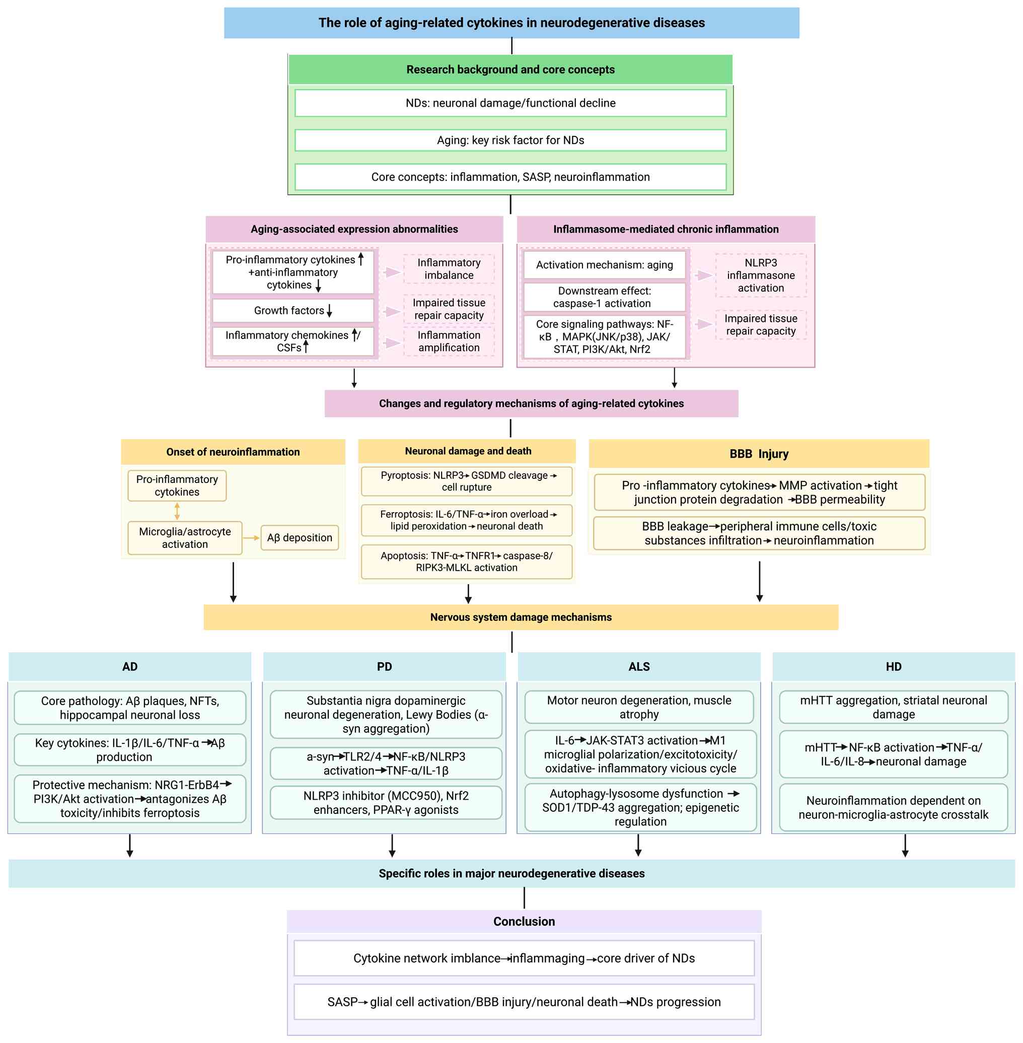 Aging is a multifaceted process characterized by the progressive decline of biological function, accompanied by chronic inflammation and disruptions in cellular homeostasis. This process is associated with the pathogenesis of neurodegenerative disease (ND). Throughout aging, immune system dysfunction results in an imbalance between pro- and anti-inflammatory factors, creating a persistent inflammatory microenvironment that exacerbates neuronal damage and synaptic dysfunction (1). Cytokines released by the senescence-associated secretory phenotype (SASP) serve a key role in mediating neuroinflammation and neuronal damage (1). Key aging-associated cytokines include IL-6, tumor necrosis factor-α (TNF-α), transforming growth factor-β (TGF-β) and chemokines such as chemokine (C-C motif) ligand 2 (CCL2) and C-X-C motif chemokine ligand 10 (CXCL10) (2). These factors intensify neuroinflammatory responses by activating microglia and astrocytes, which promote β-amyloid (Aβ) deposition, τ hyperphosphorylation and α-synuclein (α-syn) aggregation, ultimately resulting in neuronal apoptosis and synaptic dysfunction (2).