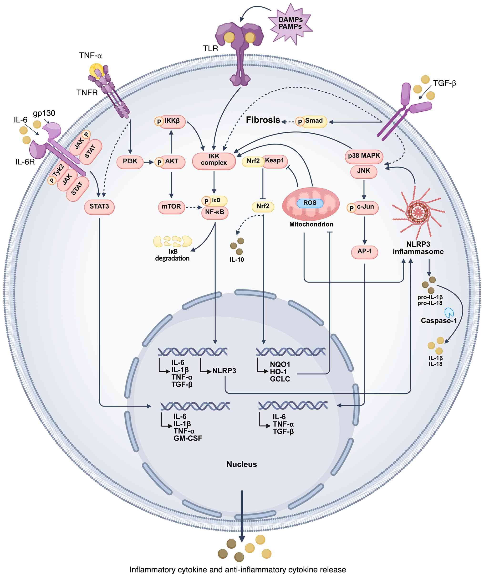 TGF-β is a pleiotropic cytokine involved in immune regulation, cell proliferation and aging (71). During aging, TGF-β signaling becomes dysregulated, contributing to chronic low-grade inflammation and fibrosis (72). Within the inflammatory network, TGF-β positively modulatse immune responses via Smad-dependent pathways (73). Moreover, it acts with NF-κB and MAPK signaling to promote tissue remodeling. Activation of the NLRP3 inflammasome may exacerbate fibrosis by upregulating TGF-β expression (74).