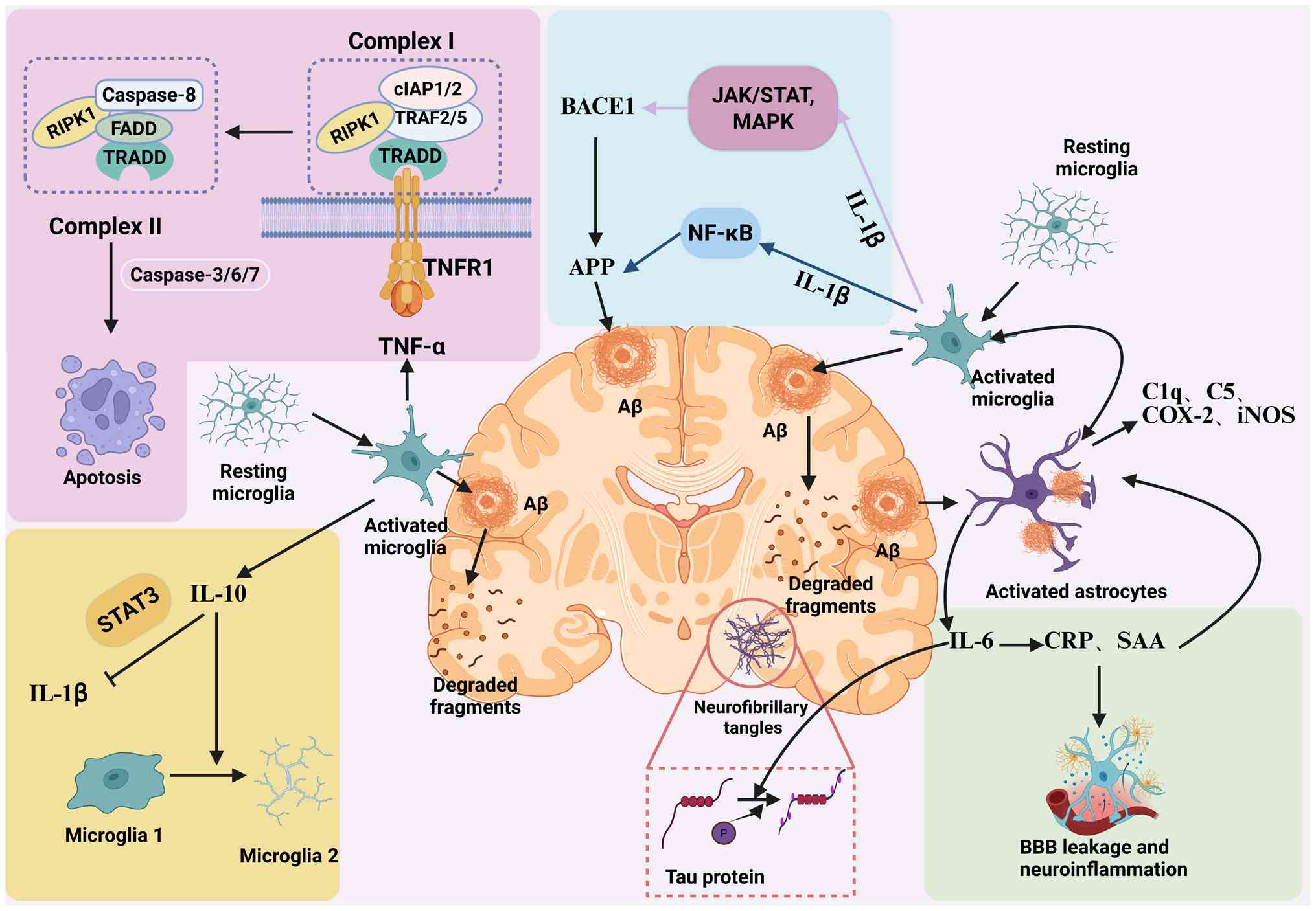 Pro-inflammatory cytokines such as IL-1β, IL-6, and TNF-α play a predominant role in exacerbating AD pathology. They not only maintain the inflammatory environment but also directly interact with and aggravate Aβ plaques and NFTs (84). IL-1β is elevated in the brain of patients with AD, particularly in association with diffuse plaques, and is predominantly produced by activated microglia during early disease stages (125). In vitro, IL-1β treatment of human neuroblastoma SH-SY5Y cells enhances APP transcription via NF-κB activation, leading to increased APP synthesis (125). These findings are supported by APP/presenilin 1 (PS1) transgenic mouse models, where IL-1β overexpression is associated with elevated cortical APP levels and accelerated amyloid deposition (125,126). IL-1β also enhances BACE1 and γ-secretase activity via MAPK and JAK/STAT signaling, contributing to Aβ overproduction (127).
