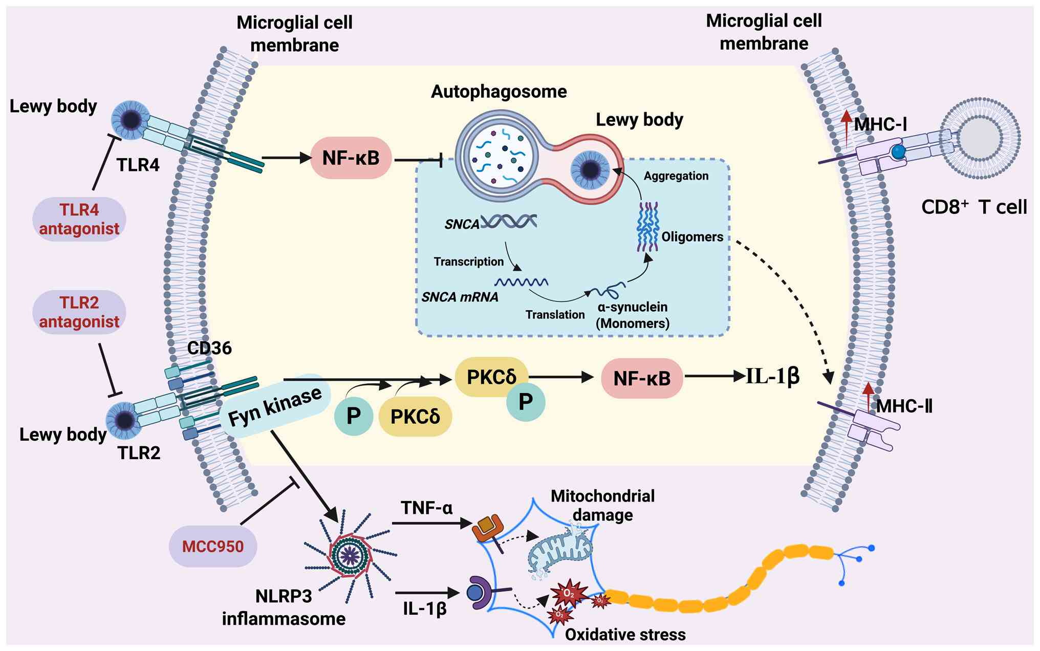 TLR4-NF-κB activation promotes α-syn sequestration into autophagosomes (155). Inhibition of TLR4 function in BV2 and TLR4 knockout primary mouse microglial cells impedes the uptake of α-syn and suppresses the production of pro-inflammatory cytokines TNF-α and IL-6 (156). Additionally, α-syn upregulates the expression of IFN-γ in microglia, which induces the expression of MHC-I on neurons, thereby enabling selective targeting by CD8+ T cells (157). The α-syn (SNCA) gene encodes α-syn and its overexpression in rat models results in reduced fiber density in DAergic neurons and an increased number of MHC-II+ microglial cells (158,159). T cells from mice immunized with nitrated α-syn exacerbate neurodegeneration in response to MPTP exposure (160). Furthermore, both type 1 and 17 helper T cells contribute to the enhancement of MPTP-induced neurodegeneration, whereas regulatory T cells exert a neuroprotective effect (161). These results support the role of T cell subsets activated by the immune response induced by α-syn in the pathogenesis of DAergic neurodegeneration. Collectively, these mechanisms establish a chronic neuroinflammatory environment in the PD brain.