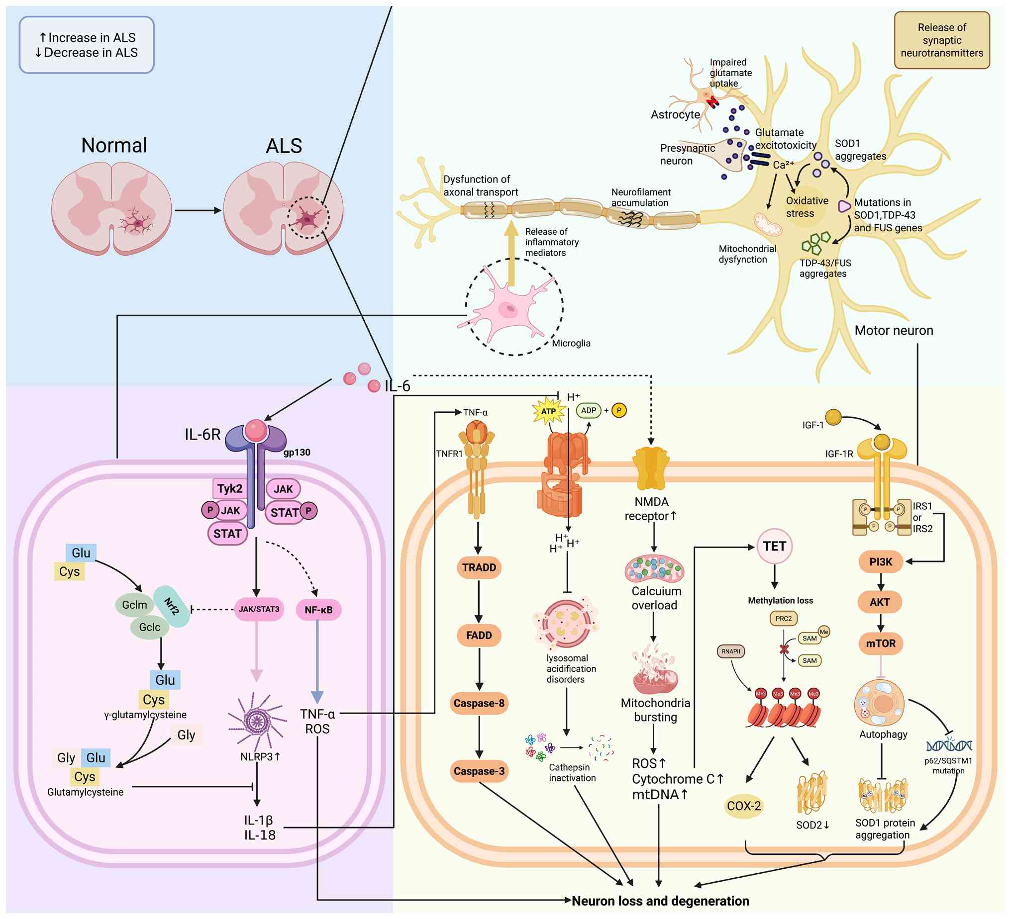 The inflammatory state in ALS is strengthened and regulated by persistent changes at the epigenetic level. Age-associated DNA methylation loss and abnormal histone modifications upregulate pro-inflammatory genes, while suppressing neuroprotective genes (184). For example, microRNA-155 enhances microglial JAK/STAT signaling by inhibiting suppressor of cytokine signaling 1, whereas the downregulation of microRNA-146a disrupts NF-κB pathway regulation, creating a positive feedback loop that drives ALS progression (185). Pro-inflammatory factors, including IL-1α, TNF-α and complement component 1, q subcomponent, A chain, are released by microglia activated by neuroinflammation, inducing neurotoxicity via alterations in astrocyte activity (109). TNF-α activates the Caspase-8/FADD signaling pathway via TNFR1, while IL-6 upregulates the pro-apoptotic protein Bax via the JAK/STAT3 pathway, both of which are implicated in the pathogenesis of ALS (186) (Fig. 5).