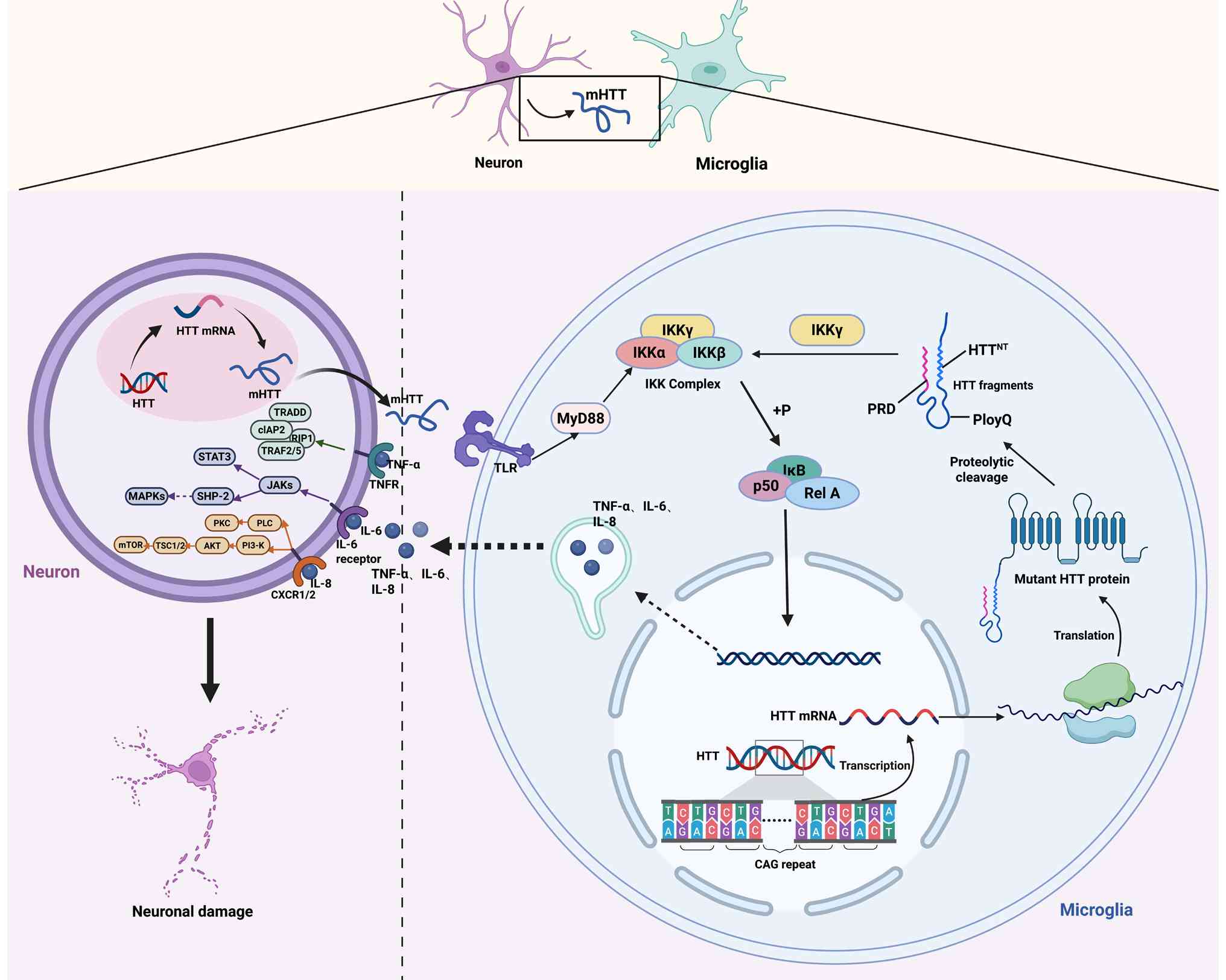 Accumulated HTT expression induces transcriptional alterations in neuronal cells, and it is possible that microglial transcription is similarly impacted (192). Björkqvist et al (195) suggested that postmortem tissue from patients with HD exhibit distinct inflammatory characteristics. Specifically, inflammatory molecules such as TNF-α and IL-1β are markedly elevated in the striatum, whereas MMP-9, IL-6 and IL-8 show increased expression in the cortex and cerebellar regions (192). This contrasts with the neuroinflammatory profiles observed in other types of ND, such as PD or AD, which typically involve the upregulation of a broader range of inflammatory molecules (196). The presence of inflammatory regulators in the striatum may signify ongoing pathological processes, while the dysregulation of molecules such as MMP-9, IL-6 and IL-8 suggests a more generalized role of mutant HTT protein expression (197). Furthermore, studies have demonstrated that monocytes expressing mutant HTT protein in patients with HD exhibit increased secretion of IL-6 (198-200). By contrast with other neurological disorders, including AD and multiple sclerosis, the involvement of peripheral immune cells, such as neutrophils and lymphocytes, in HD has not been thoroughly explored (201). Furthermore, studies have indicated that significant infiltration of T cells is not observed in postmortem tissue of individuals with HD (202,203). Consequently, neuroinflammation in HD is predominantly sustained by the interactions among neurons, microglia and astrocytes (192) (Fig. 6).