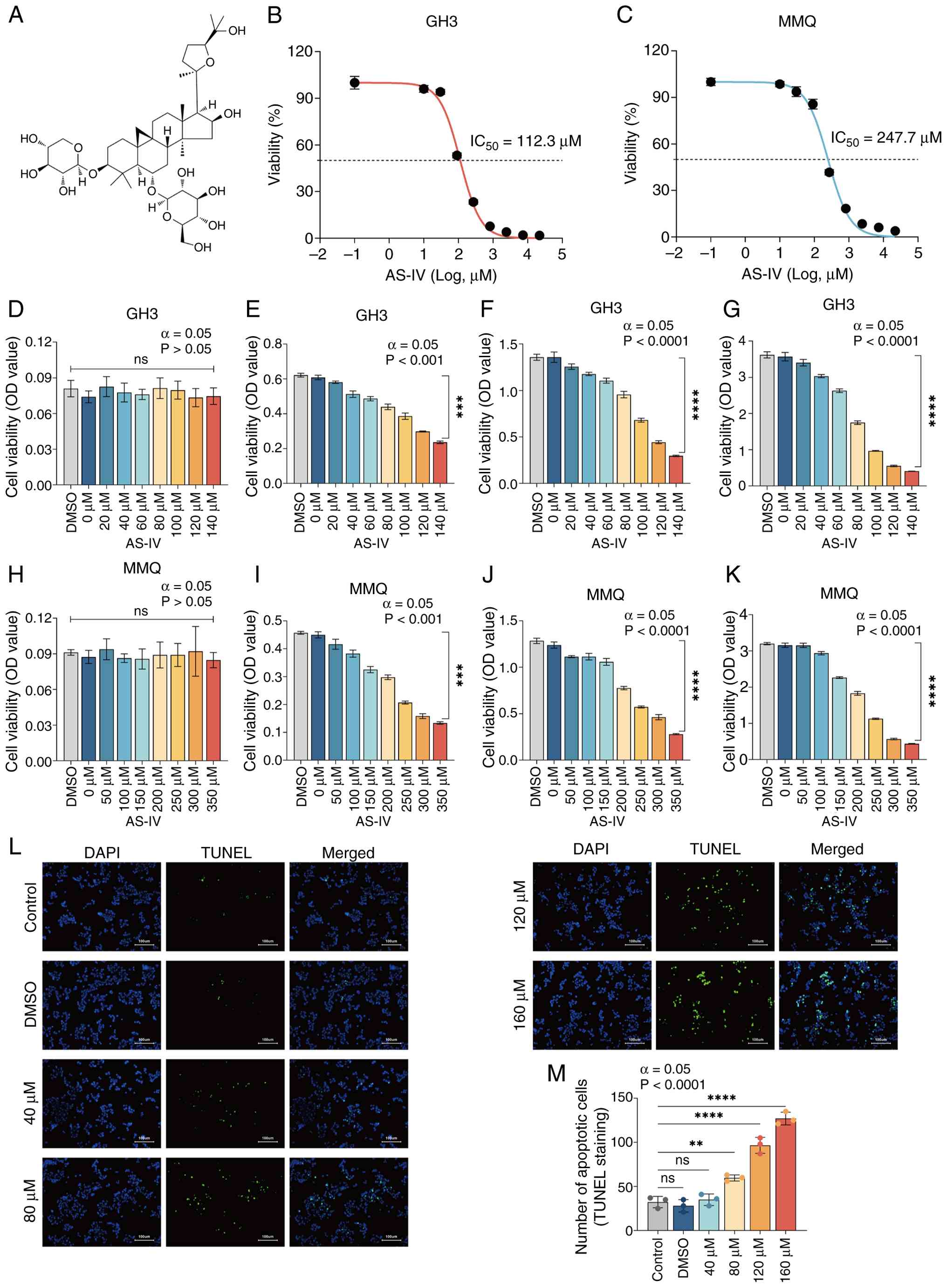 CCK-8 assay demonstrated that AS-IV significantly inhibited the activity of GH3 and MMQ cells in a concentration- and time-dependent manner (Fig. 1D-K). The chemical structure of AS-IV is shown in Fig. 1A. The IC50 values detected after 48 h AS-IV treatment in GH3 and MMQ cells were 112.3 and 247.7 μM, respectively (Fig. 1B and C). To ensure consistency in subsequent experiments, 48 h was selected as the treatment duration and IC50 values were used as the drug concentration for AS-IV intervention.