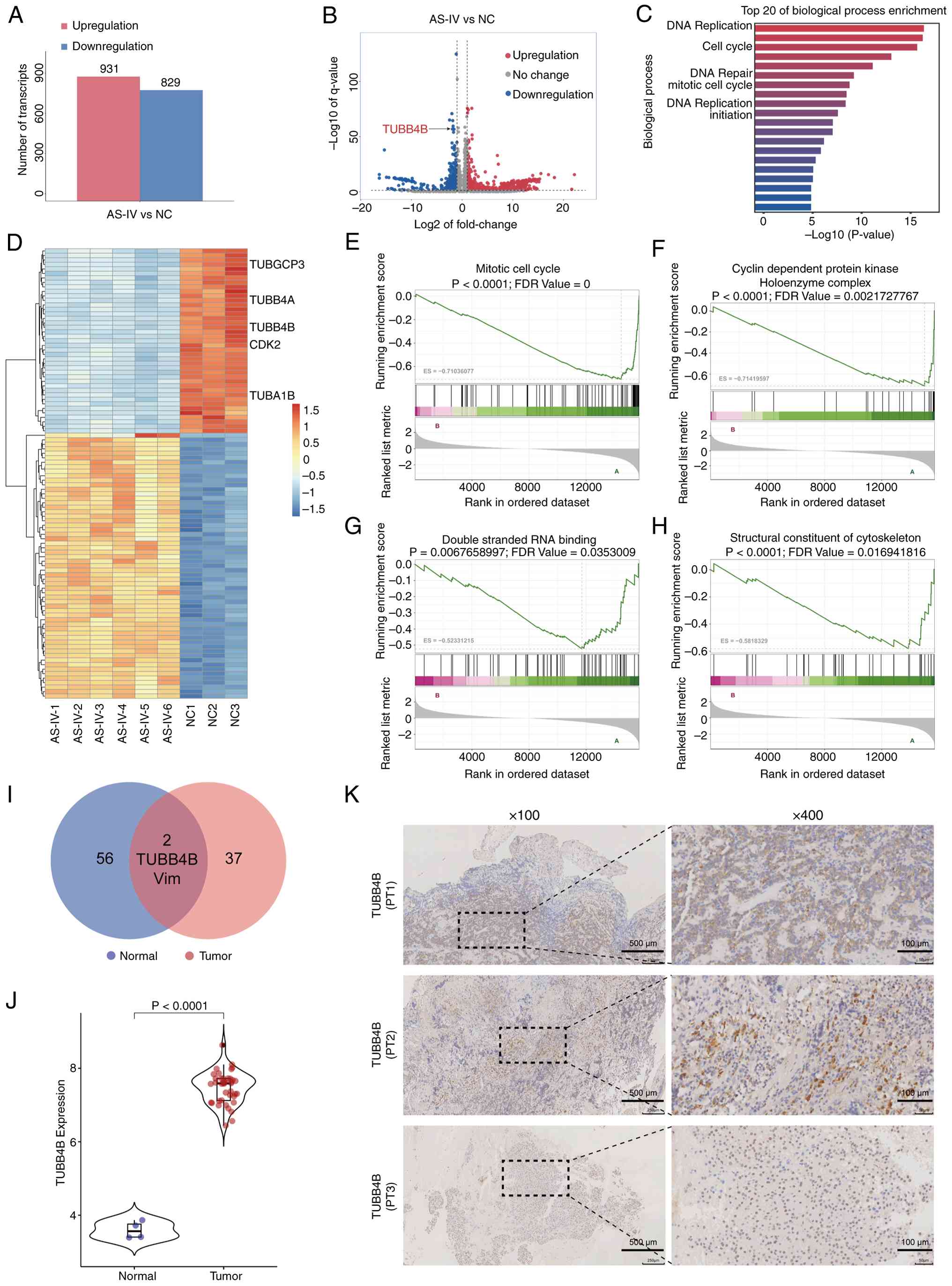To explore the key signals and related pathways underlying the AS-IV-mediated inhibition of GH3 cell proliferation, single-cell sequencing of AS-IV-treated GH3 cells was performed. Compared with the NC group, 931 up- and 829 downregulated DEGs were identified (Fig. 2A and B). GO enrichment analysis in the biological process category (Fig. 2C) revealed that the functions of the DEGs were enriched in 'DNA replication' and 'cell cycle'. A heatmap of the transcriptomic DEGs (Fig. 2D) revealed that the tubulin family (which synthesizes the cytoskeleton) (25), especially TUBB, was significantly downregulated in the AS-IV group. GSEA revealed that genes were significantly downregulated in 'mitotic cell cycle', 'cyclin-dependent protein kinase holoenzyme complex', 'double-stranded RNA binding' and 'structural constituent of cytoskeleton' (Fig. 2E-H). As these enriched gene sets are associated with tubulin-associated functions, it was hypothesized that there was a potential link between cytoskeletal organization and RNA binding, with TUBB4B possibly serving as a bridging molecule. To explore this hypothesis, we selected the gene lists of 'double-stranded RNA binding' and 'structural constituent of cytoskeleton' to construct a Venn diagram (Fig. 2I), which revealed that TUBB4B was present in the intersection. It was hypothesized that TUBB4B may be a key gene mediating AS-IV-induced inhibition of pituitary tumor proliferation and promotion of apoptosis. GEO data demonstrated that TUBB4B expression in pituitary tumor tissues was significantly higher than that in normal pituitary tissue (Fig. 2J), which was consistent with the IHC staining results of pituitary tumor tissue from patients (Fig. 2K). These results confirm that TUBB4B is highly expressed in pituitary tumors.