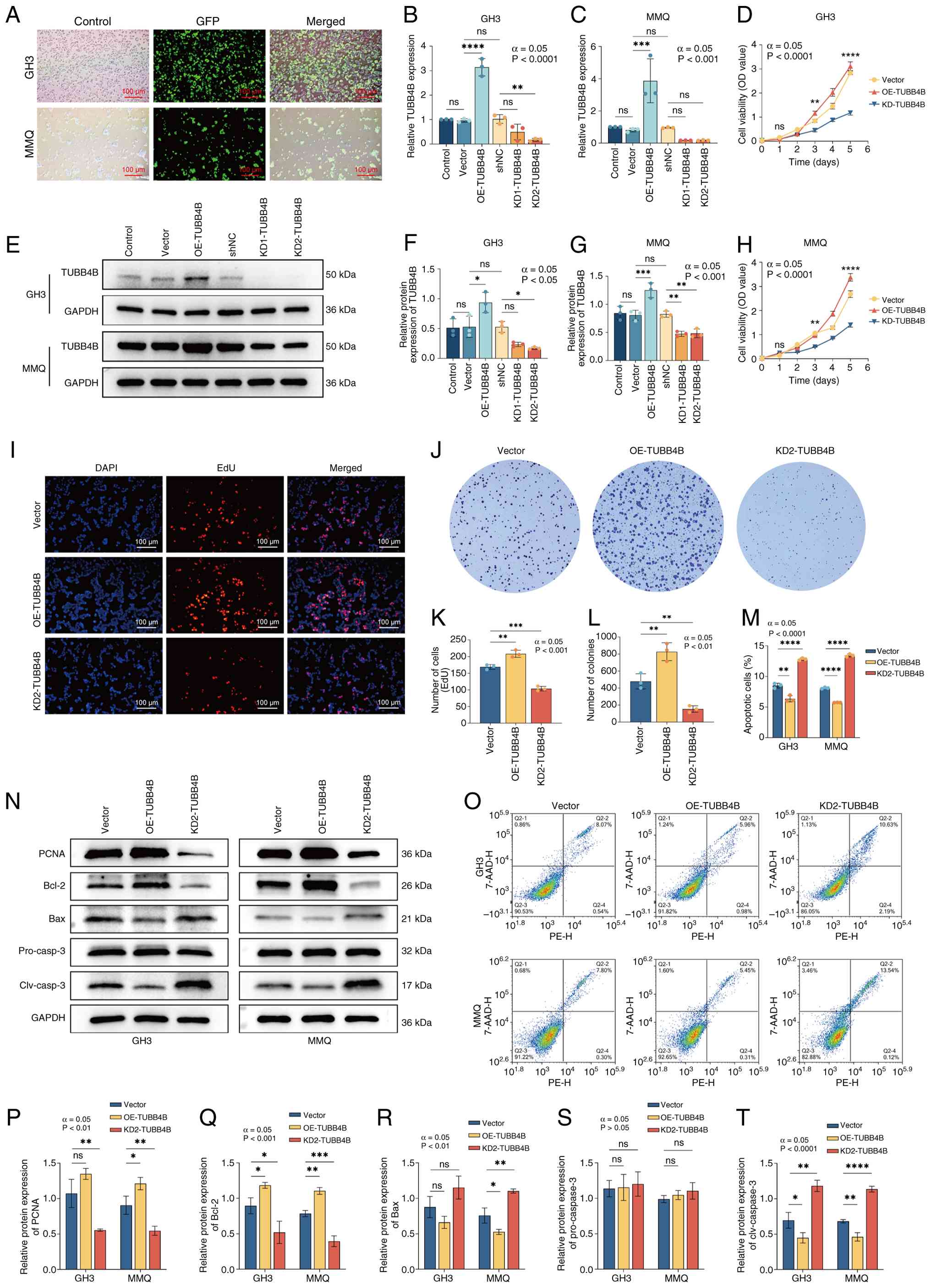 Cell viability was assessed with the CCK-8 assay. In both cell lines, viability in the OE-TUBB4B group was greater than that in the shNC group, which was significantly greater than that in the KD2-TUBB4B group (Fig. 3D and H). EdU assays revealed that the number of proliferating GH3 cells (in the S phase of DNA synthesis; red fluorescence) was highest in the OE-TUBB4B group and lowest in the KD2-TUBB4B group (Fig. 3I and K). Colony formation assay (Fig. 3J and L) revealed that the number of colonies in the OE-TUBB4B group was significantly greater than that in the shNC group, which was greater than that in the KD2-TUBB4B group. Flow cytometry confirmed that OE-TUBB4B decreased the proportion of apoptotic cells, whereas KD-TUBB4B increased the percentage of apoptotic cells in both cell lines (Fig. 3M and O). Western blotting was used to verify the expression of proliferation-associated protein (PCNA) and apoptosis-related proteins (Bcl-2, Bax, pro-caspase-3 and cleaved-caspase-3) in both cell lines (Fig. 3N and P-T). OE-TUBB4B cells had increased expression of PCNA and antiapoptotic protein (Bcl-2) and decreased expression of proapoptotic proteins (Bax and cleaved-caspase-3); in KD2-TUBB4B cells, decreased expression of PCNA and Bcl-2 was observed, along with increased expression of Bax and cleaved-caspase-3. Cells in the OE-TUBB4B group exhibited increased expression of PCNA and Bcl-2 and decreased expression of Bax and cleaved caspase-3; in contrast, cells in the KD2-TUBB4B group exhibited decreased expression of PCNA and Bcl-2, and increased expression of Bax and cleaved caspase-3, confirming the regulatory role of TUBB4B. In summary, TUBB4B promotes the proliferation and inhibits the apoptosis of pituitary tumor cells.
