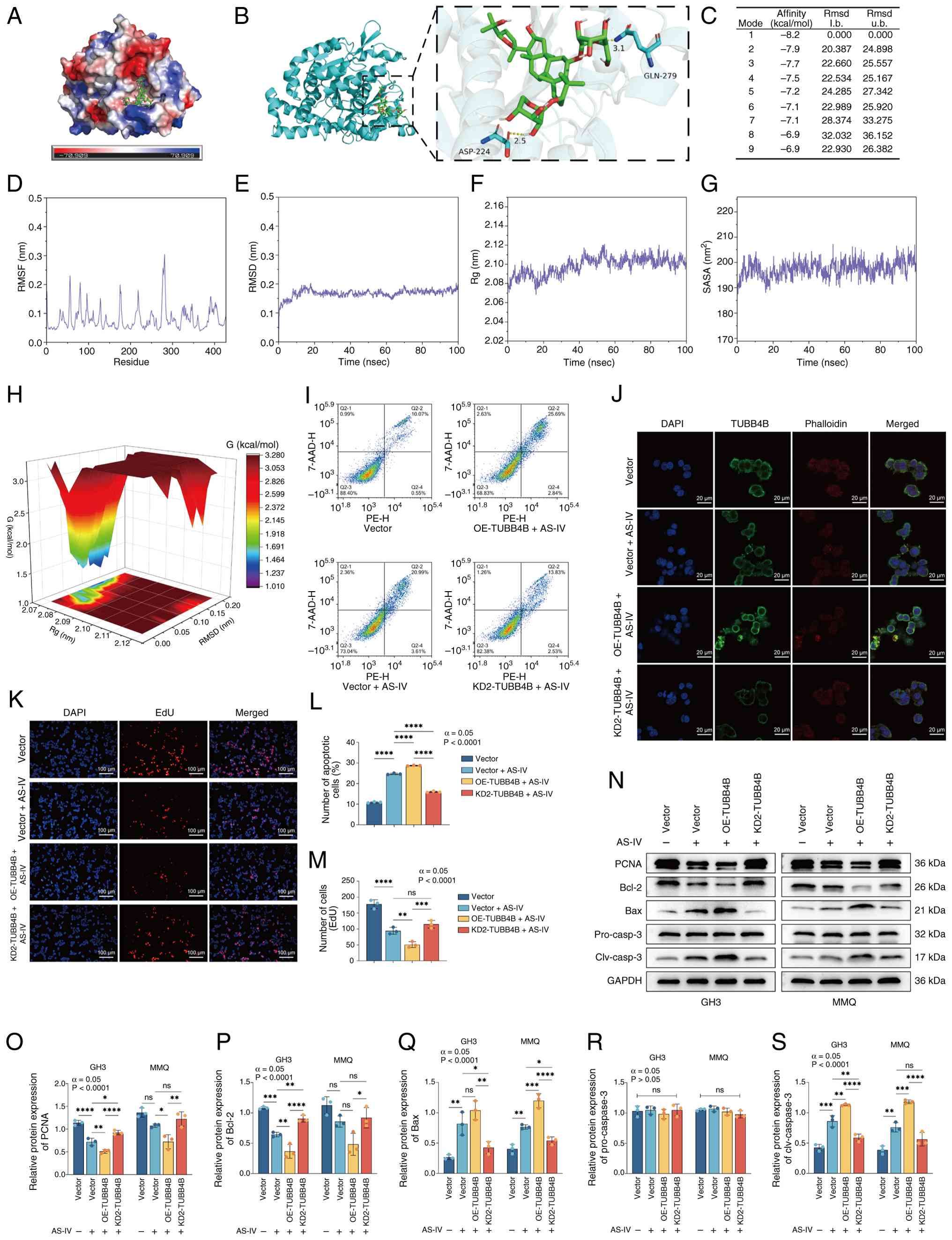 To verify that AS-IV inhibits pituitary tumors by targeting TUBB4B, molecular conformations of TUBB4B and AS-IV were generated. The surface electrostatic potential of the TUBB4B protein is shown in Fig. 4A, and molecular docking was performed between AS-IV and TUBB4B (Fig. 4B). The binding energies of multiple TUBB4B protein conformations with AS-IV indicated a high degree of fit in the binding pocket and a binding energy of −8.2 kcal/mol (Fig. 4C). These findings confirmed that AS-IV and TUBB4B had strong binding activity and bind under natural conditions. On the basis of the molecular docking results, a 100 nsec molecular dynamics simulation was performed on the AS-IV-TUBB4B complex to investigate its binding stability and dynamic behavior. RMSF (Fig. 4D) of the AS-IV-TUBB4B complex fluctuated at residues 56, 80, 175, 277-282 and 427, which may be associated with the function of TUBB4B affected by AS-IV; the RMSD (Fig. 4E) fluctuated in the early stage (0-20 nsec) but stabilized at 20-100 nsec, indicating that the structure of the complex was relatively stable; the Rg value (Fig. 4F) remained stable at ~2.1 nm, indicating that the structure of the complex was compact and the SASA (Fig. 4G) of the entire system was relatively stable. Free energy landscape of the complex demonstrated that the conformation of the AS-IV-TUBB4B complex was stable when the Rg values ranged from 2.07 to 2.09 nm and the RMSD was 0.03-0.17 nm (Fig. 4H).