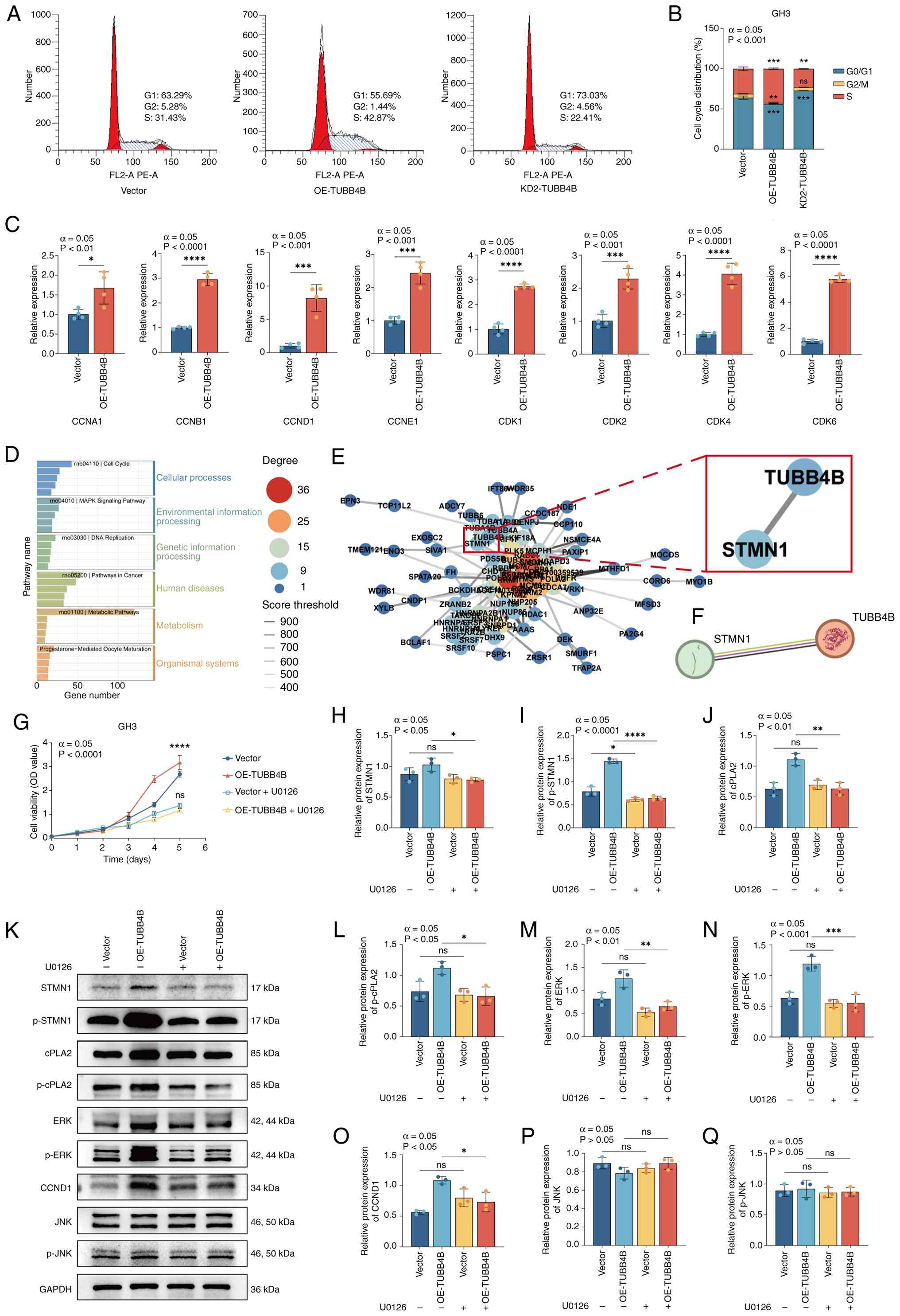 To investigate the mechanism of TUBB4B, GH3 cells were transduced with lentivirus to establish OE-TUBB4B and Vector stable cell lines. Following the manufacturer's instructions, the cells were treated with 60 nM U0126 (a MEK/ERK pathway inhibitor) at 37°C with 5% CO2 for 48 h, after which cell viability was assessed using the CCK-8 assay.