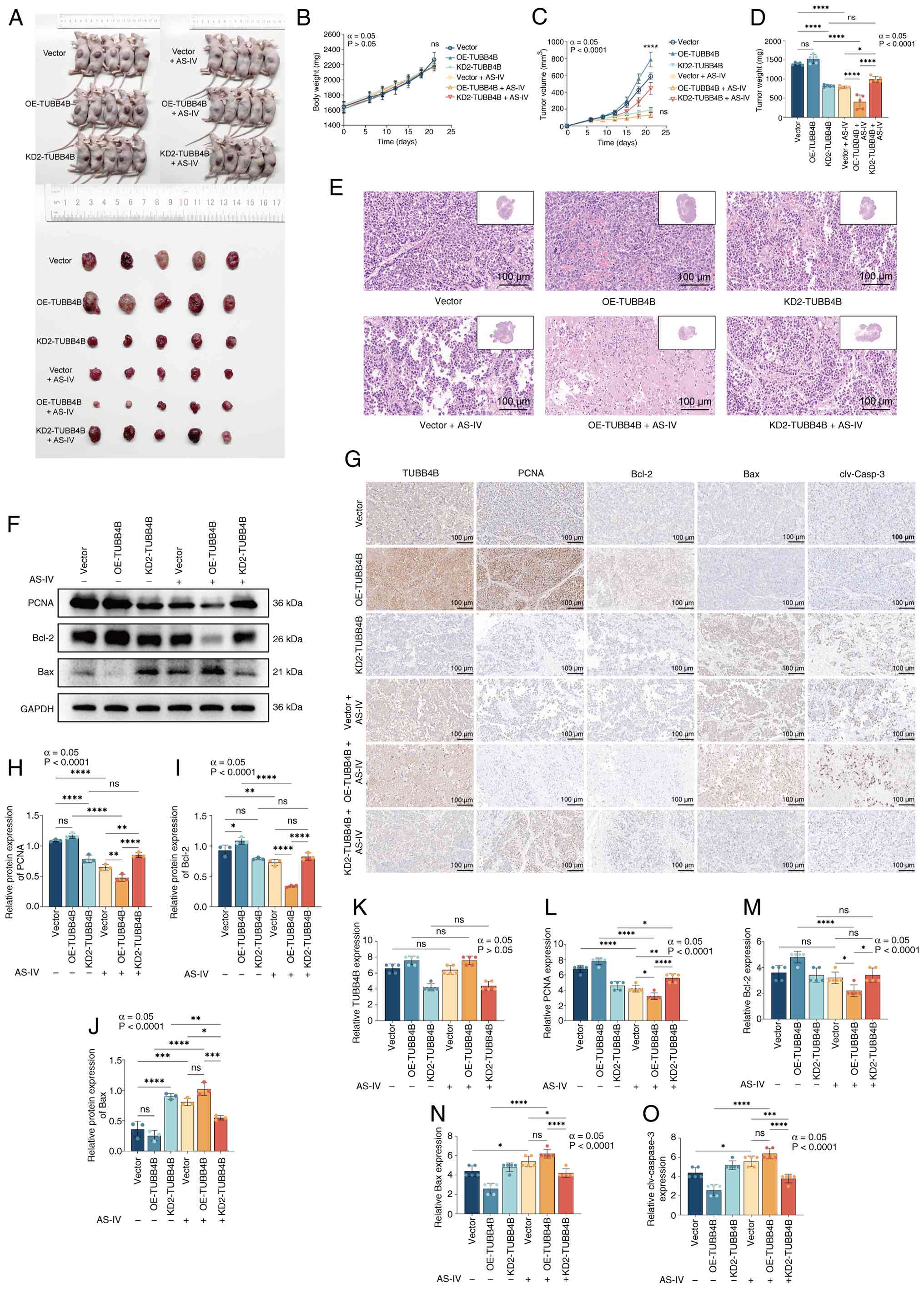 To verify the reliability of the in vitro cell experiments in vivo, a nude mouse subcutaneous xenograft model was established using TUBB4B-regulated GH3 cell lines (Fig. 6A). There was no significant difference in body weight between any groups (Fig. 6B), which was attributed to the benign nature of the GH3 cell line. Compared with the Vector group, both tumor volume and weight were significantly increased in the OE-TUBB4B group, whereas they were decreased in the KD2-TUBB4B group (Fig. 6C and C). Compared with the Vector + AS-IV group, both tumor volume and weight were decreased in the OE-TUBB4B + AS-IV group, whereas they were increased in the KD2-TUBB4B + AS-IV group. Overall, the trends in tumor volume and weight were consistent across the groups. The largest tumor was observed in the OE-TUBB4B group, with a maximum tumor diameter of 12.7 mm, a volume of 892 mm3 and a mass of 1,671 mg. Compared with the shNC group, the OE-TUBB4B group presented notable blood sinuses and the tumor cells exhibited the highest density, large in size, and have a high nucleus-to-cytoplasm ratio, consistent with a state of high proliferation; the KD2-TUBB4B and shNC + AS-IV group presented partial nuclear fragmentation and cytoskeletal fragmentation/degradation in tumor tissue; the OE-TUBB4B + AS-IV group presented notable nuclear pyknosis/fragmentation and severe apoptosis and necrosis of tumor tissue and the KD2-TUBB4B + AS-IV group presented partial nuclear shrinkage but relatively regular tissue morphology (Fig. 6E). Western blotting (Figs. 6F, H-J and S4A-C) and IHC staining (Fig. 6G and K-O) results for the xenograft tumor tissue were consistent with those of the in vitro experiments; compared with the Vector group, the OE-TUBB4B group exhibited increased expression of PCNA and Bcl-2 proteins and decreased expression of Bax and cleaved-caspase-3 proteins; while the KD2-TUBB4B group exhibited the opposite trends in these protein expressions compared to the Vector group; Following AS-IV intervention, the OE-TUBB4B+AS-IV group exhibited lower PCNA and Bcl-2 protein expression compared to the Vector + AS-IV group, while Bax and cleaved-caspase-3 protein expression was higher; conversely, the KD2-TUBB4B+AS-IV group showed the opposite trends in these protein expressions compared with the Vector + AS-IV group. These results were consistent with the aforementioned findings that OE-TUBB4B increased the effectiveness of AS-IV, while KD-TUBB4B attenuated effectiveness. Fig. 7 shows the schematic of the overall mechanism by which AS-IV regulates proliferation and apoptosis in pituitary tumors by targeting of TUBB4B. In summary, AS-IV inhibited proliferation and promoted apoptosis of xenograft tumors in animals by targeting of TUBB4B.