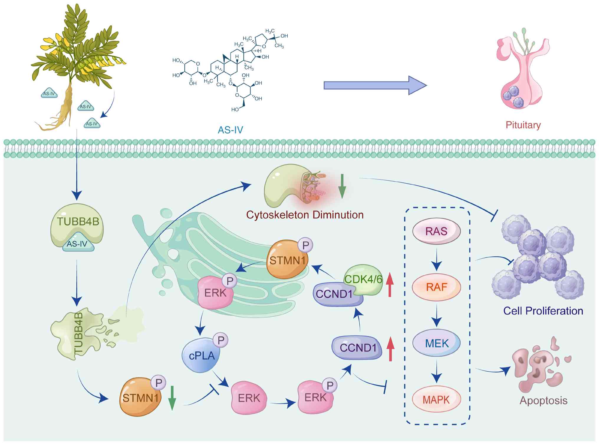 The present study demonstrated that AS-IV significantly inhibited pituitary tumor cell proliferation and induced apoptosis by targeting TUBB4B and regulating the STMN1/ERK signaling pathway. AS-IV inhibited pituitary tumor cell viability in a concentration- and time-dependent manner, with its molecular mechanism relying on high-affinity binding to TUBB4B and regulation of the downstream STMN1/ERK pathway. To the best of our knowledge, the present study is the first to reveal that TUBB4B OE enhances AS-IV efficacy and TUBB4B regulation affects pituitary tumor cell sensitivity to AS-IV. These findings not only demonstrate the anti-pituitary tumor mechanism of AS-IV but also provide a novel strategy for targeted drug therapy of pituitary tumors and a basis for exploring multitarget regulation by active components in traditional Chinese medicine.