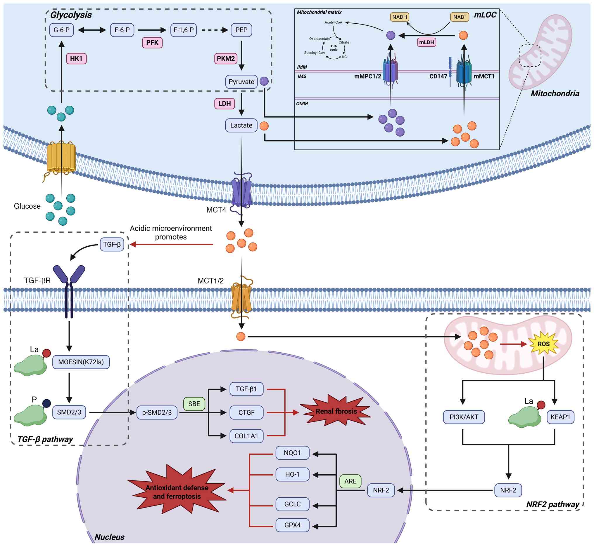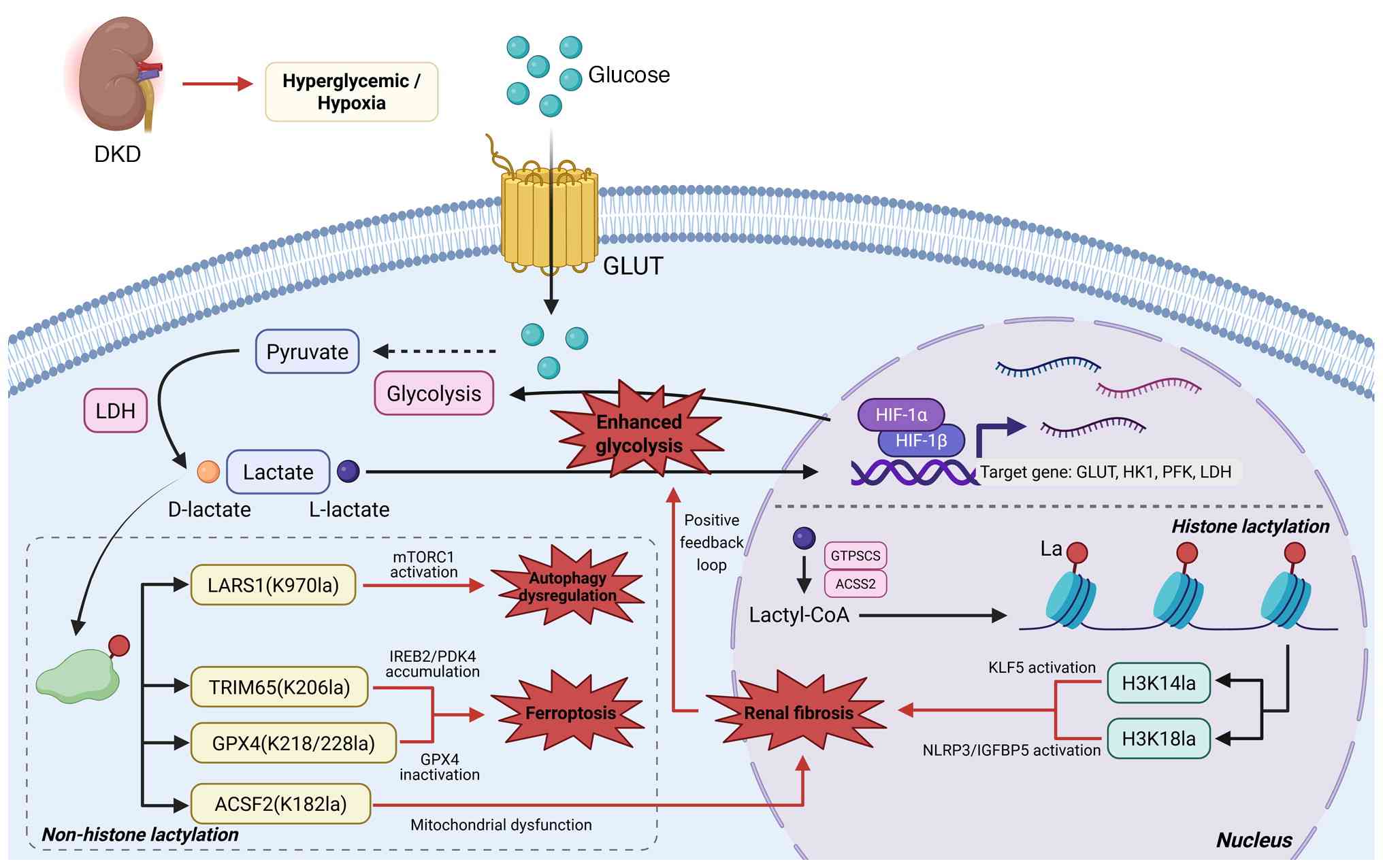 The early phases of DKD are characterized by mild renal inflammation, which progresses to renal fibrosis and sclerosis, culminating in end-stage renal disease (206). Renal fibrosis is characterized by the activation and proliferation of myofibroblasts and excessive ECM deposition (141), with TGF-β serving as a pivotal profibrotic mediator (85). Consequently, protein lactylation, driven by glycolytic flux, has been proposed as a key epigenetic mechanism. This process may contribute to the conversion of metabolic signals into a sustained fibrotic program across diverse renal cell populations, potentially serving as a metabolic mediator for the establishment of pathological memory.